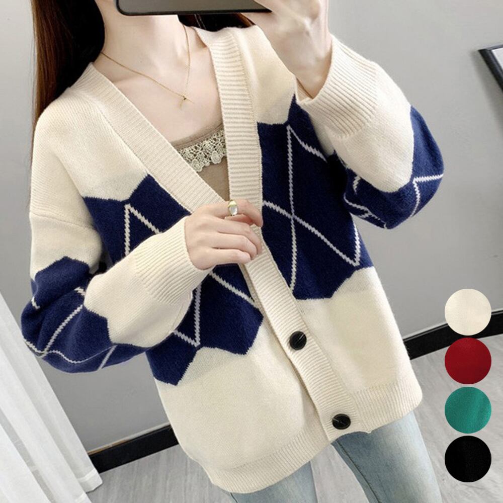 レディース アーガイル柄カーディガン 羽織り ニットアウター 韓国風 Vネック 秋服カジュアル 前開き トップス通勤通学