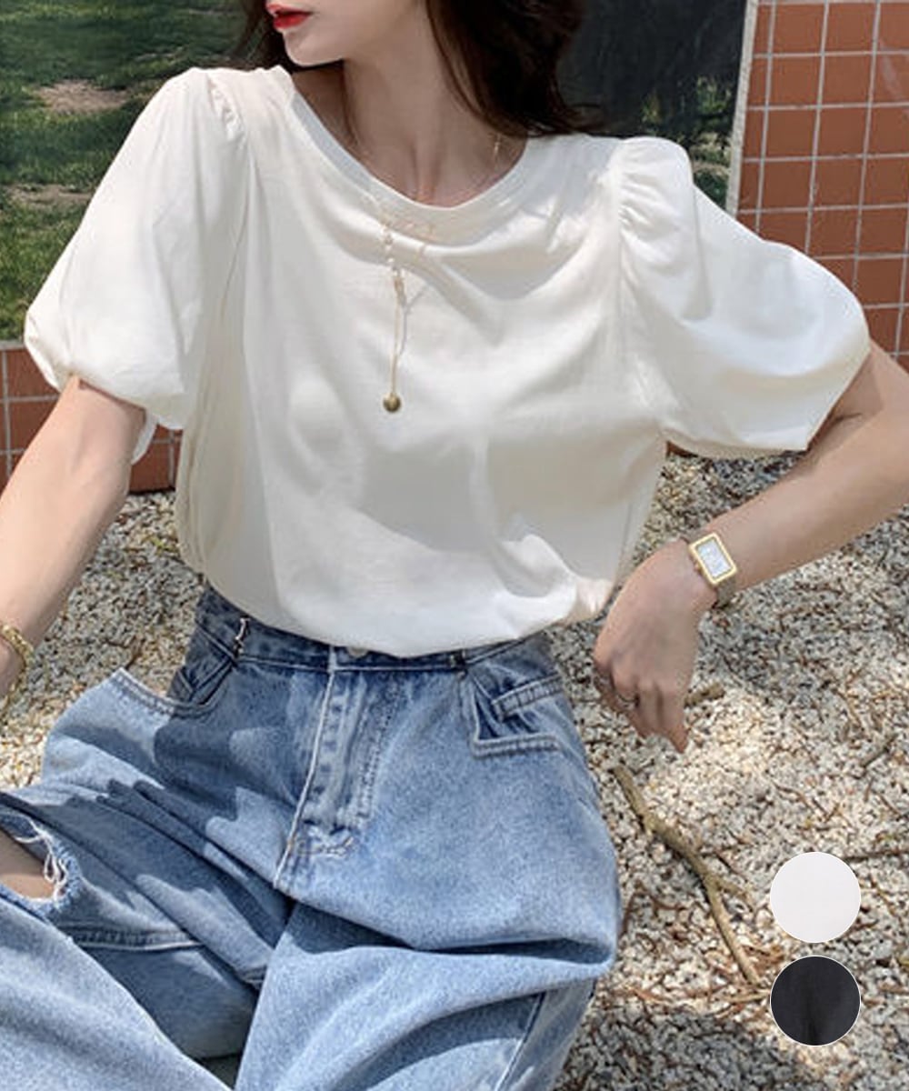 きれいめトップス春夏 シンプルtシャツ ボリューム袖カットソー バルーンスリーブブラウス クルーネックtシャツカジュアル