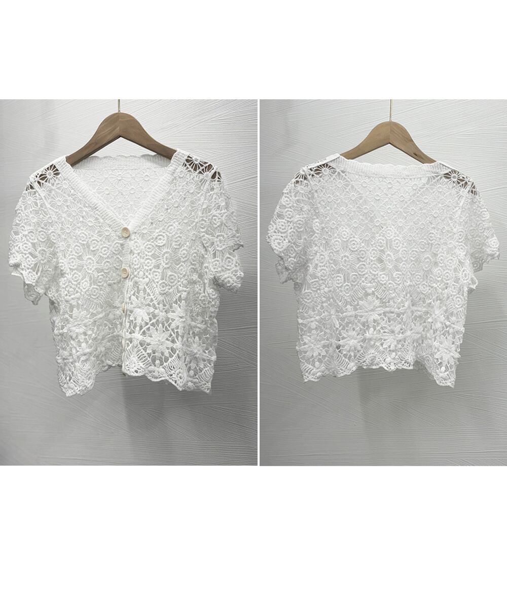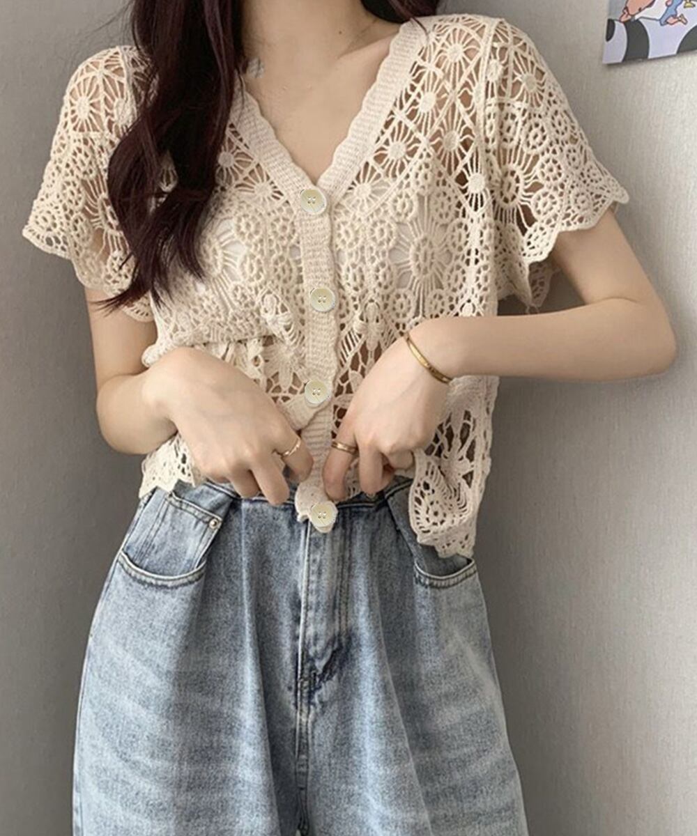 かぎ針編み サマーカーディガン レディース かわいい 韓国風 透かしトップス 薄手 Vネック サマーニットトップス 花柄