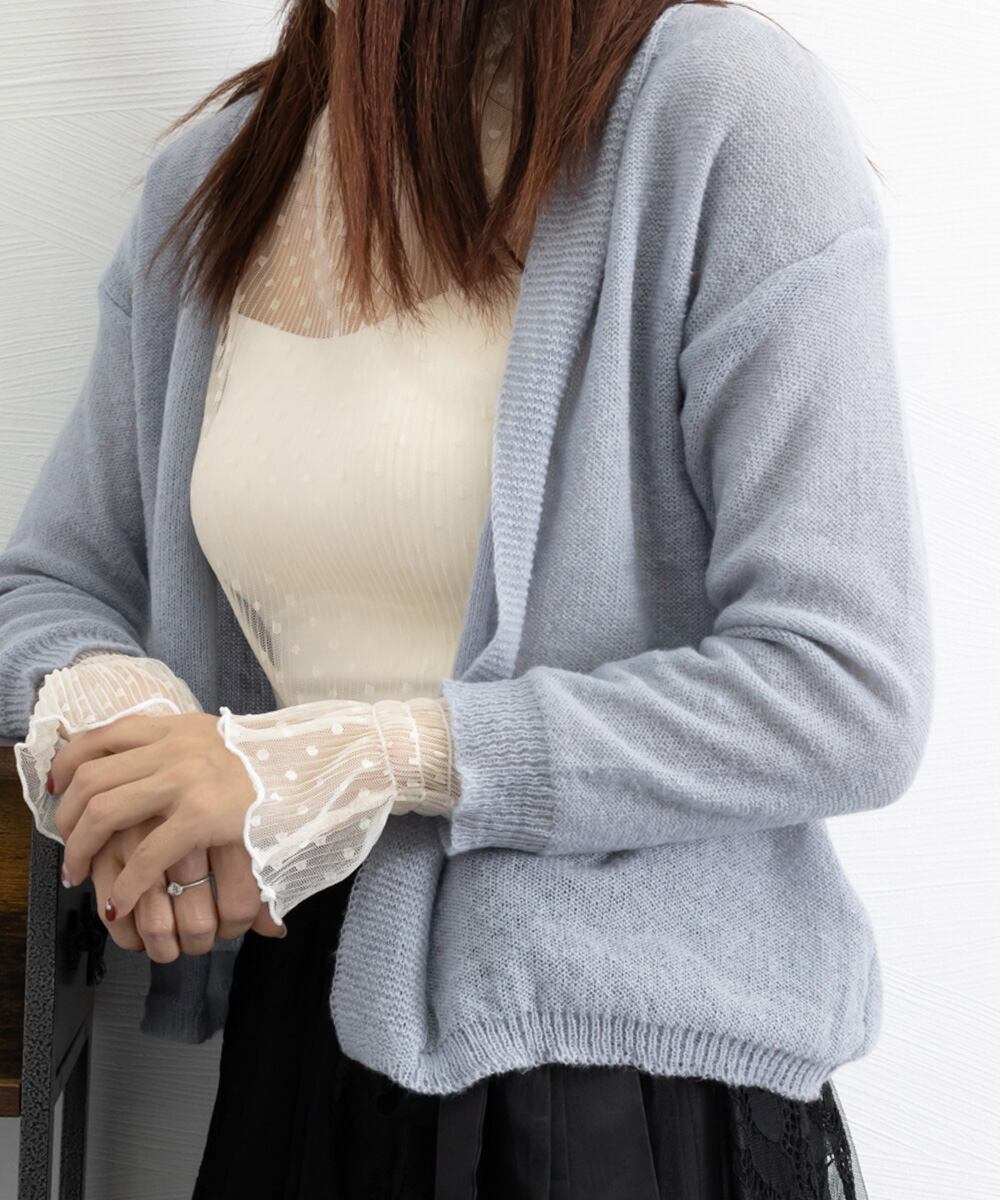 透け感が女性らしい、薄手ニット素材のカーディガン