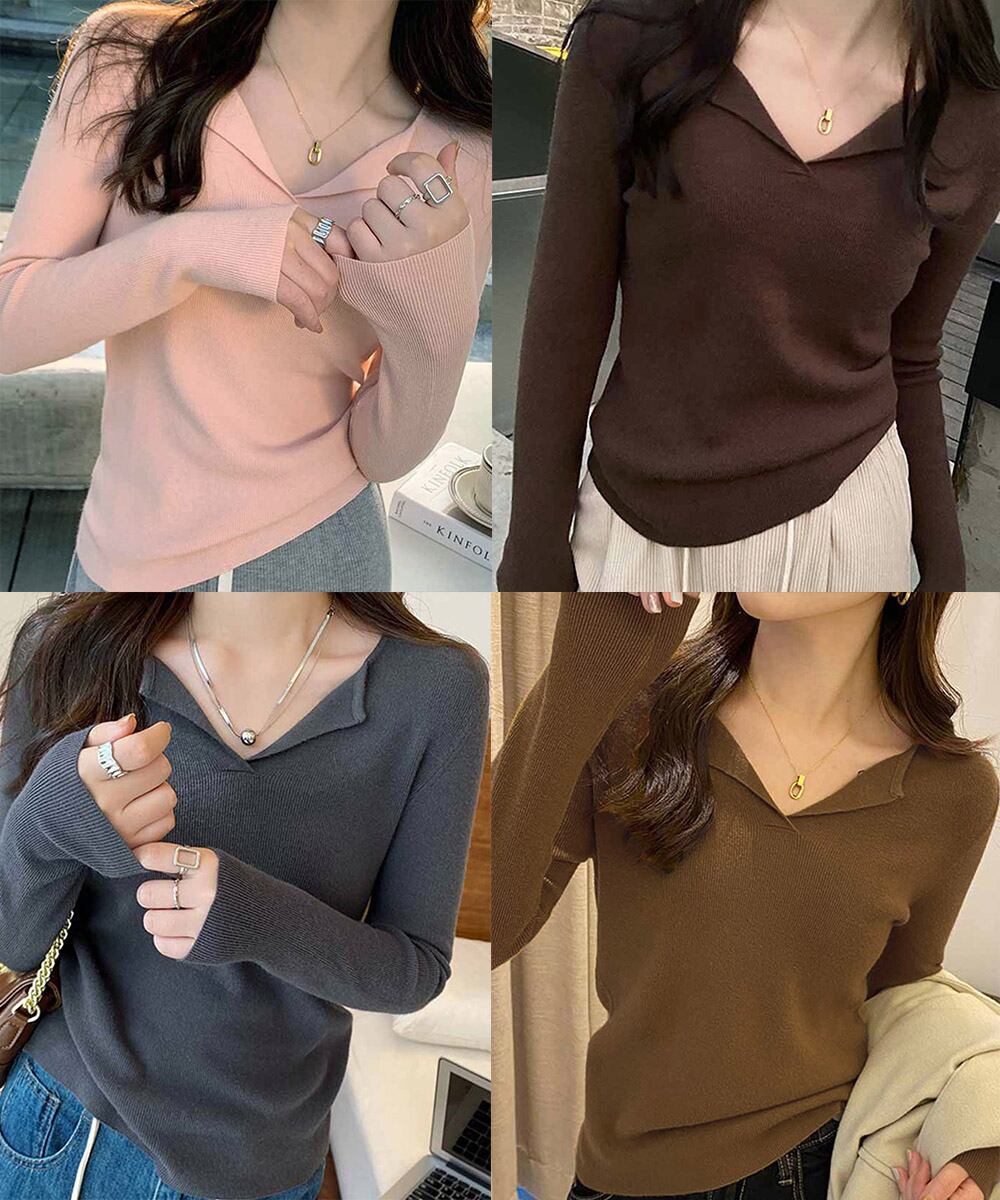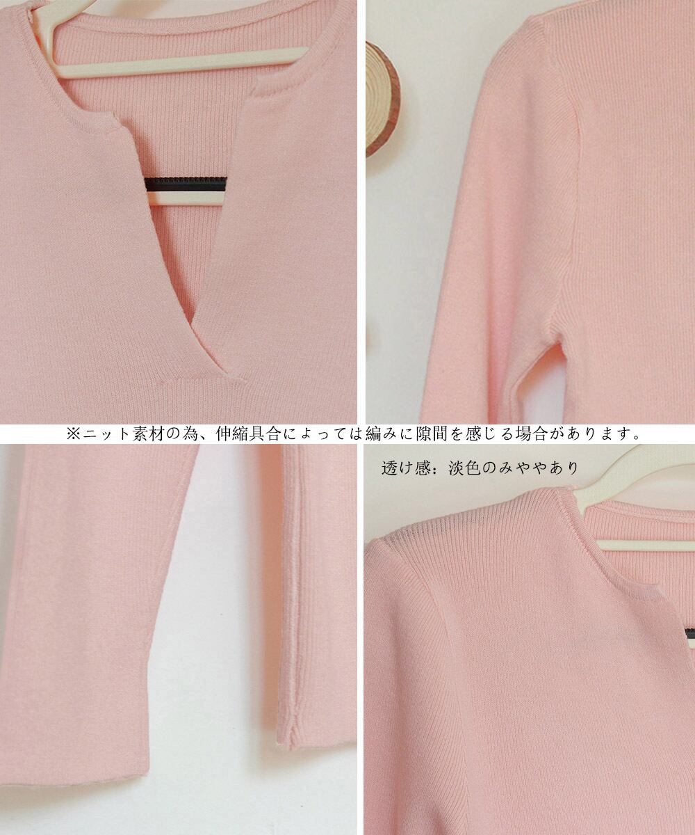 vネックで首元がすっきり綺麗に見える長袖タイトニットトップス