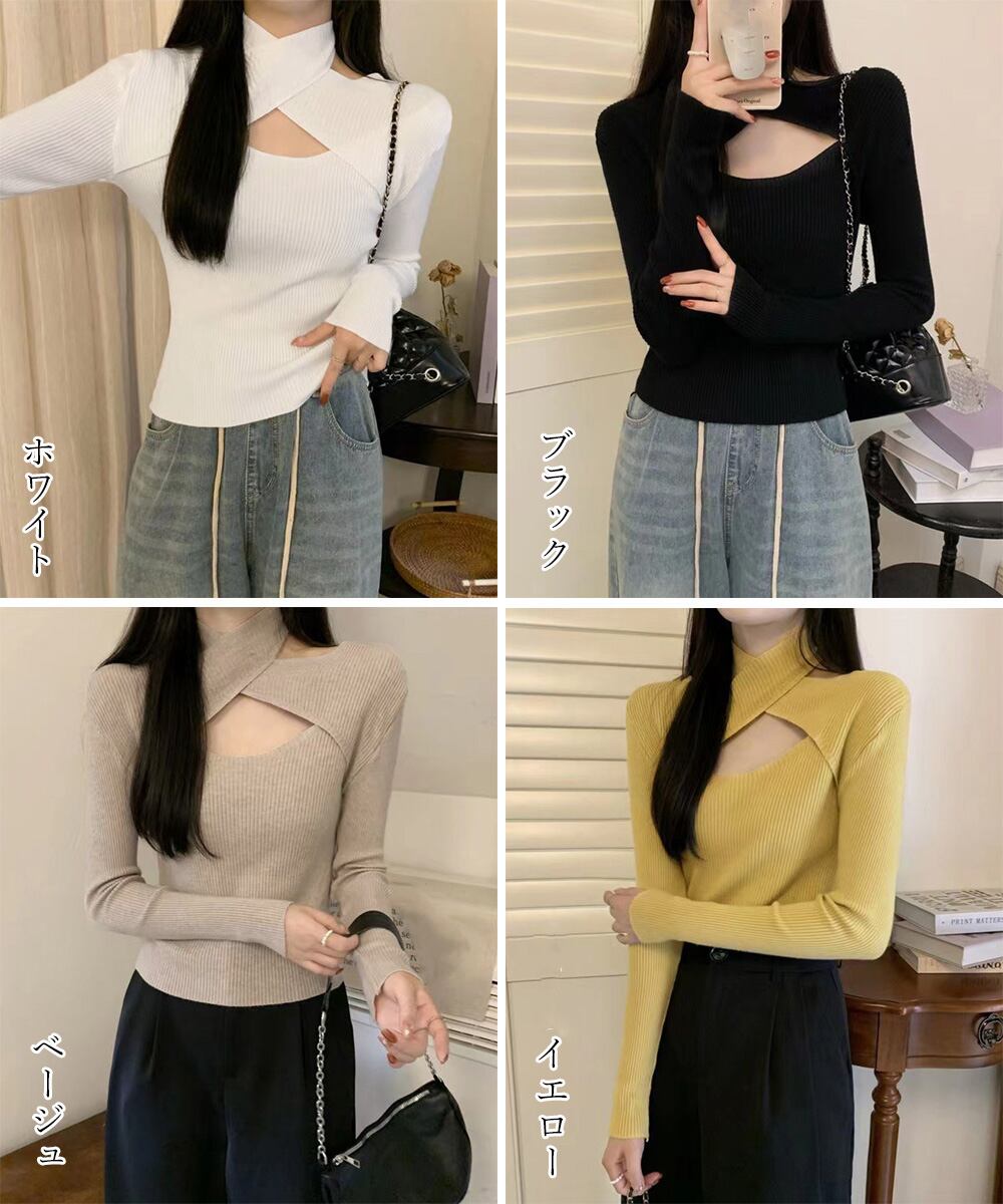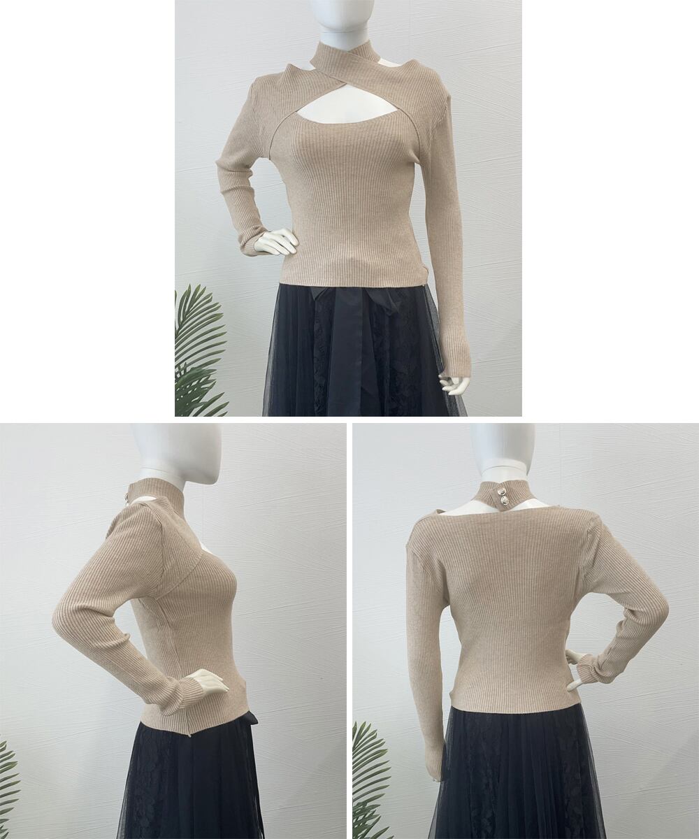 フロントの肌みせデザインが目を惹くホルターネックニットトップス