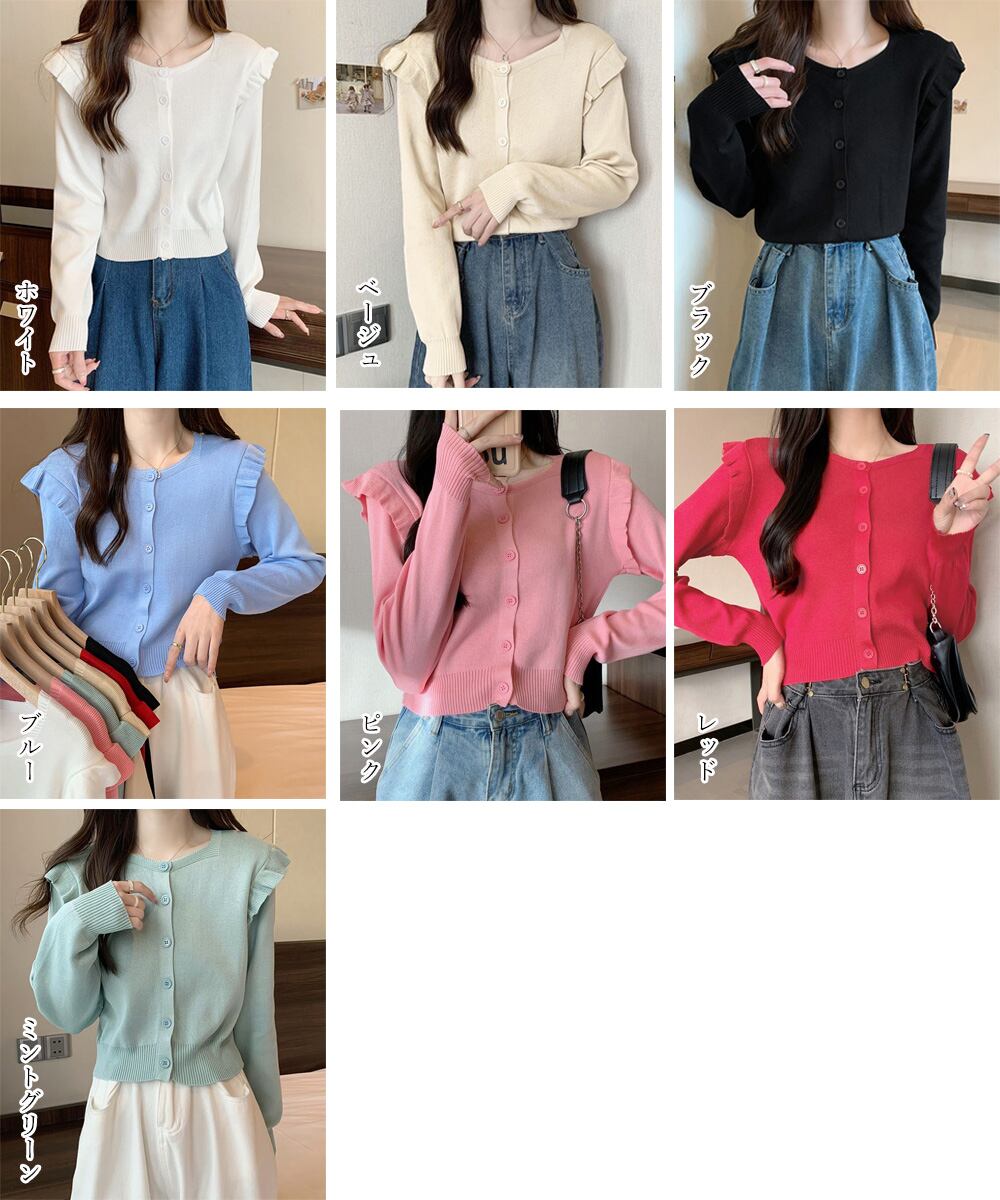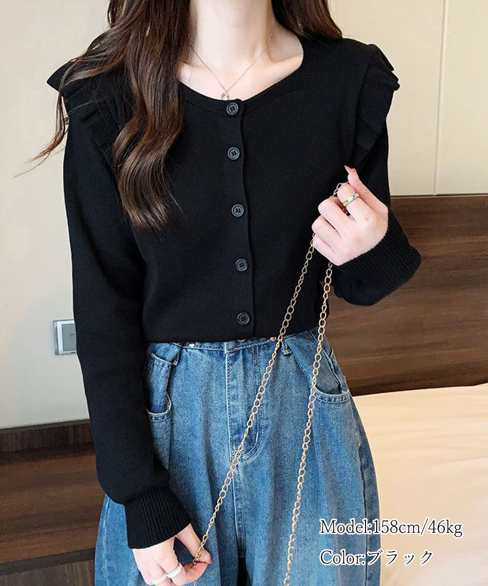 肩周りフリルのデザインが可愛らしいニットカーディガン