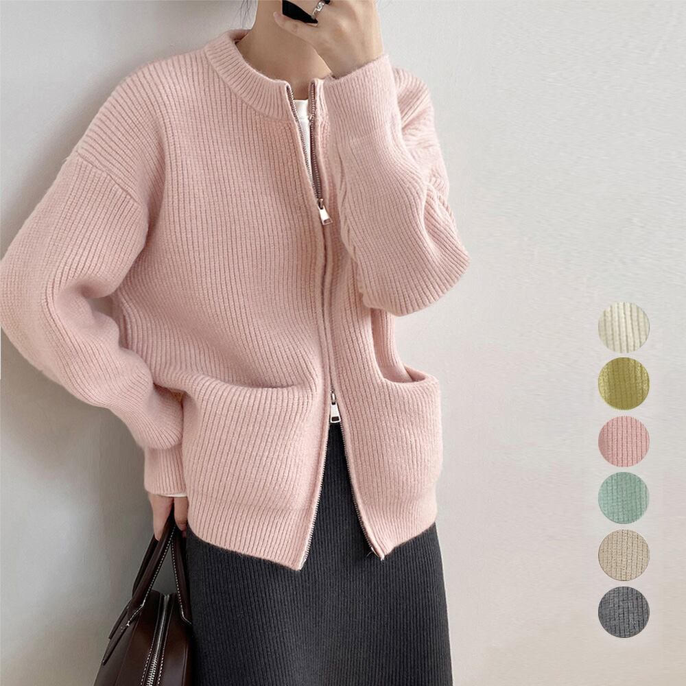 レディース ダブルジップ 秋冬ニットトップス 前開き 無地ニットセーター おしゃれ 長袖 ニット羽織り カジュアル 韓国