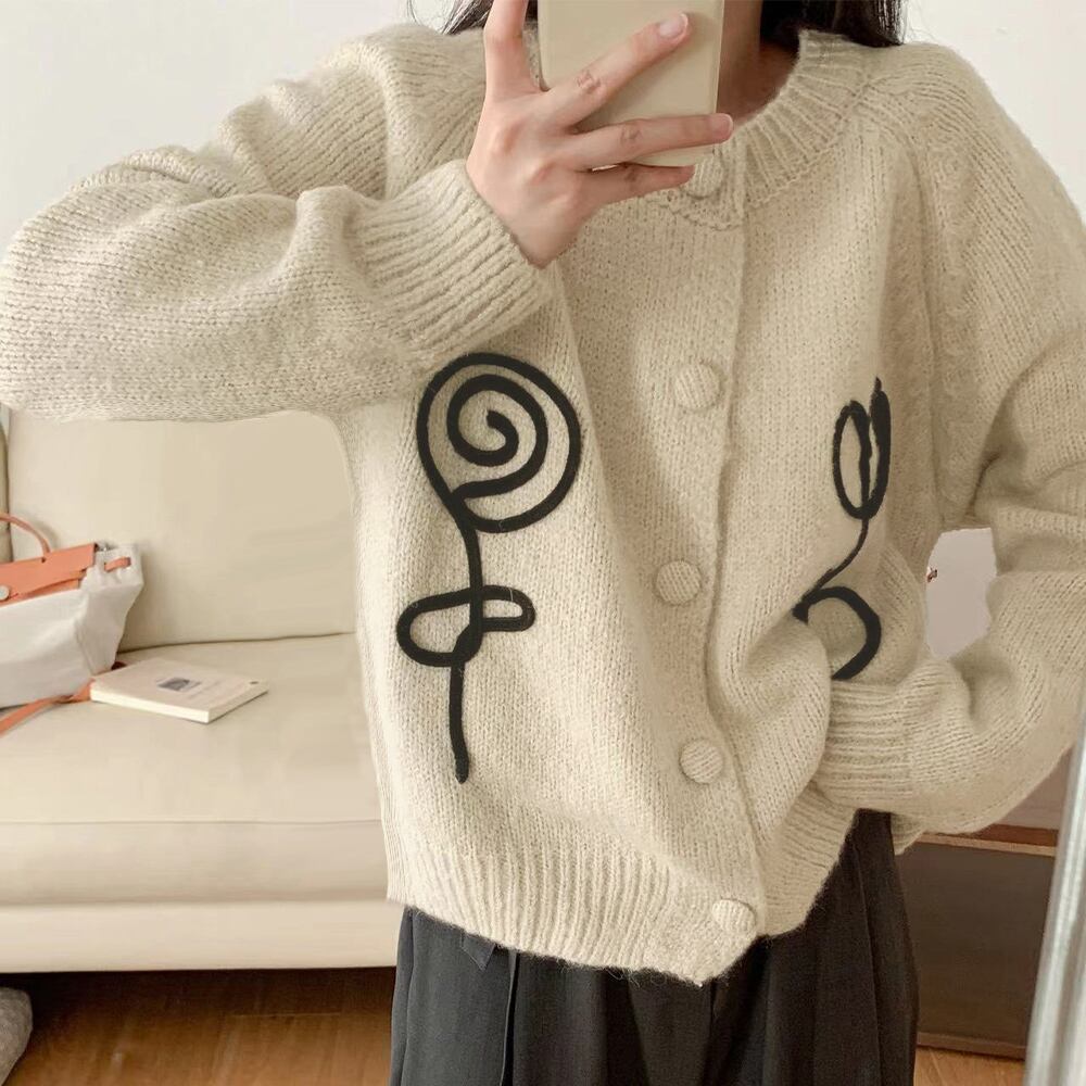 レディース 花刺しゅうニットトップス お洒落 長袖秋服 冬服 ニットアウター 韓国きれいめカジュアル 羽織り大人かわいい