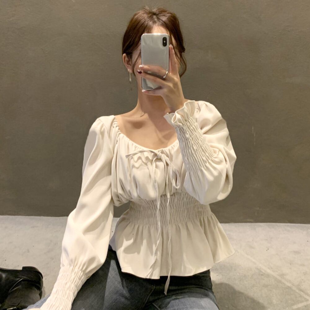 スクエアネック無地 ブラウス 上品通勤 ガーリーコーデ韓国