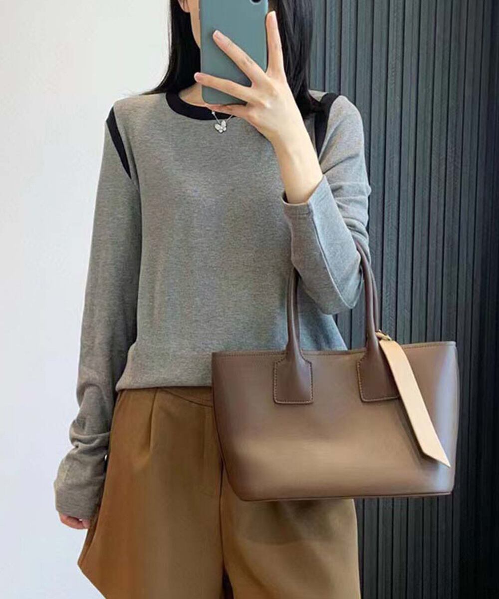 お洒落カットソー ラウンドネック春秋 Tシャツ配色着やせ