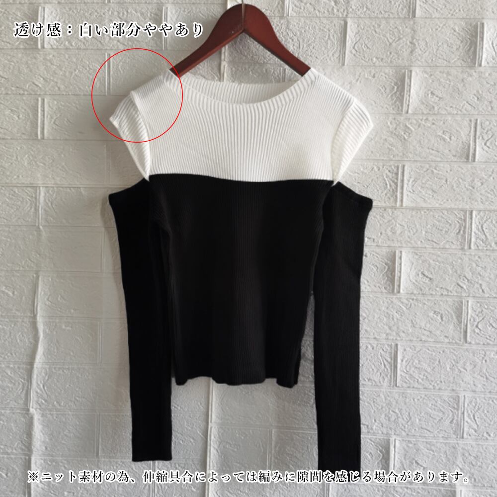 肩の部分をカットすることによってオフショルのような大人っぽガーリーデザインのニットトップス