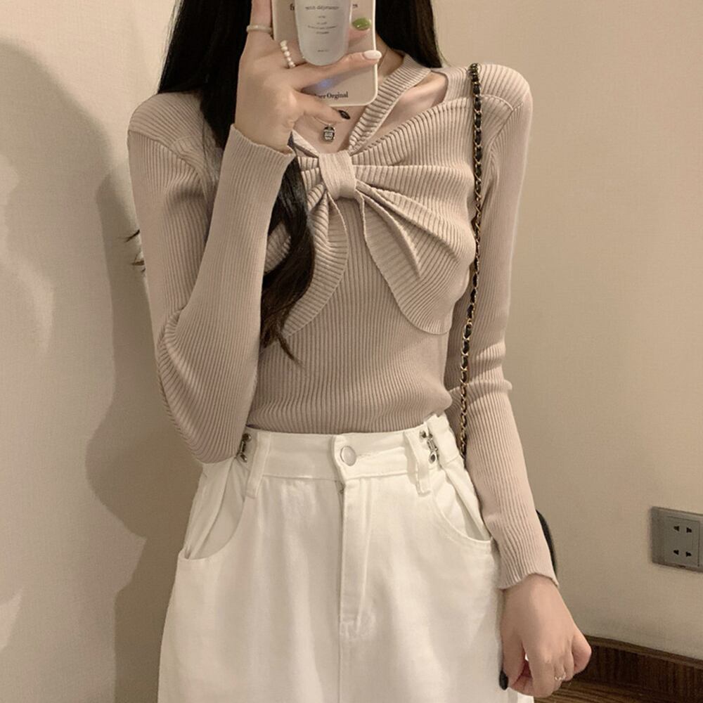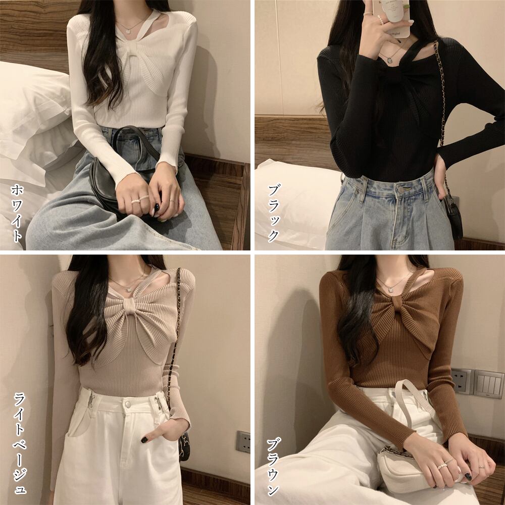 フロントの大きいリボンデザインとホルターネックがお洒落なニットトップス