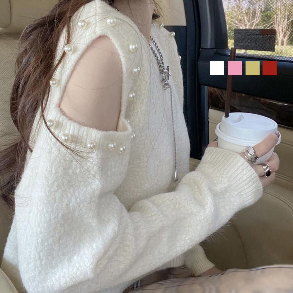パールをあしらった肩開きデザインである肌見せに大人可愛い長袖ニットトップスです
