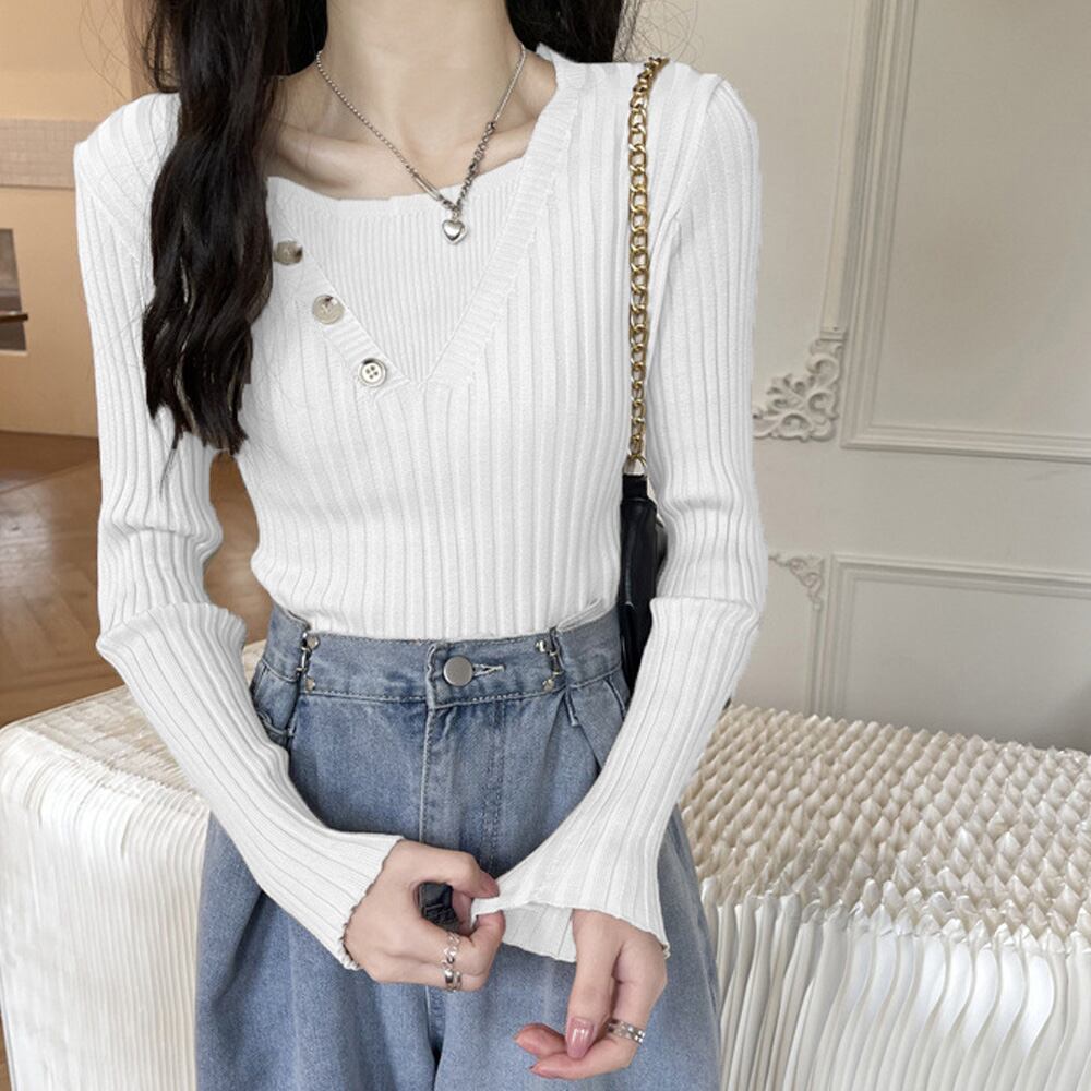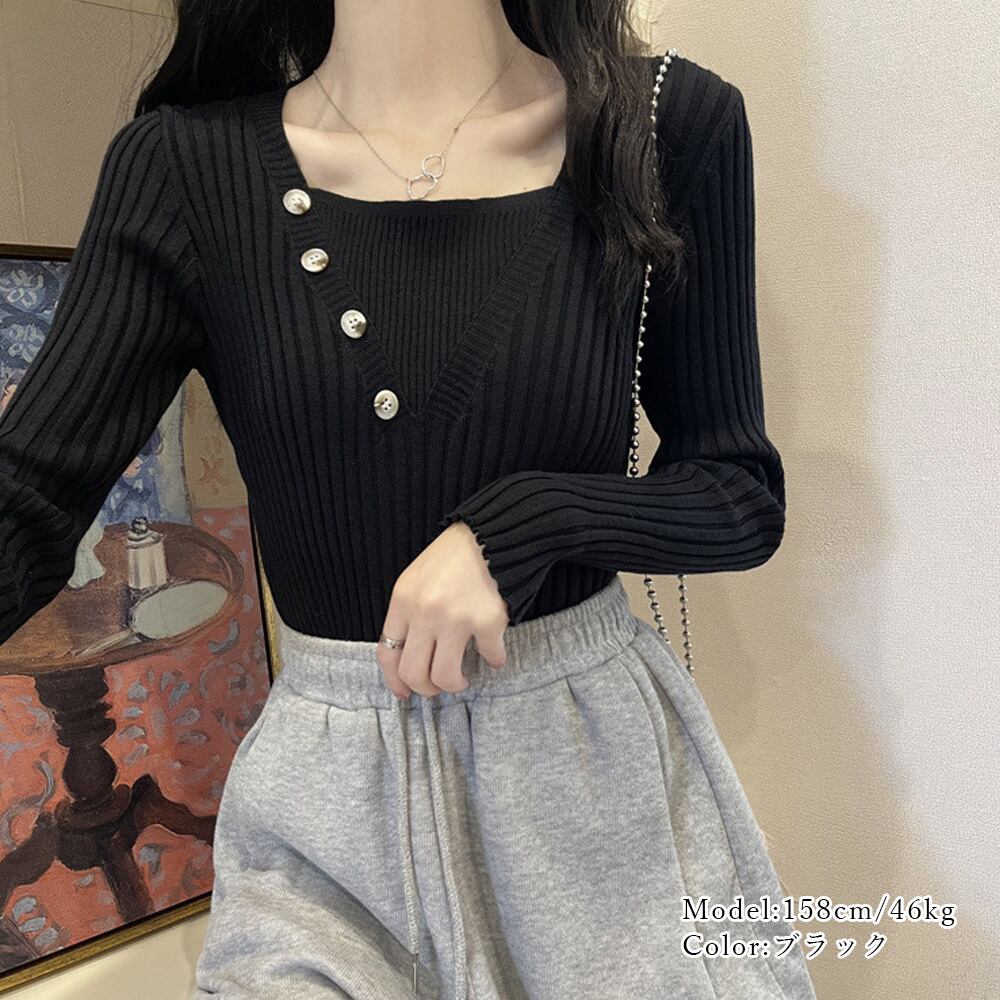 レディース 飾りボタン ニットウェア カジュアル 着やせ ニットセーター スクエアネック 無地ニットソー 着回し 長袖