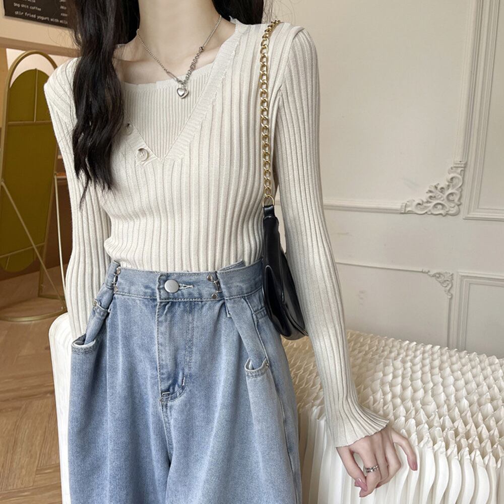 レイヤード風 リブニットトップス 韓国風