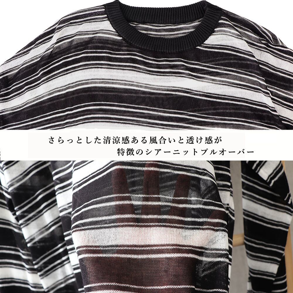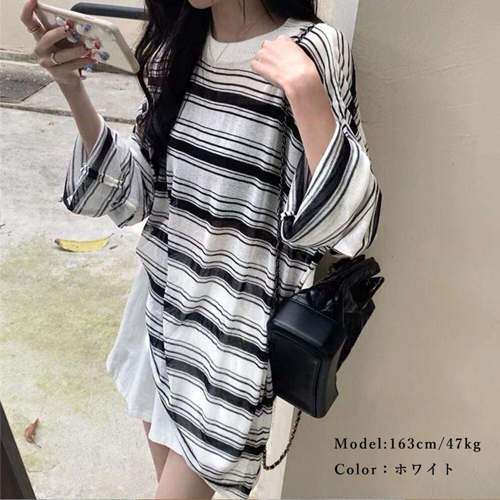 ラウンドネック プルオーバー ゆったり 透け ボーダー カットソー おしゃれ tシャツ 春秋夏 韓国ファッション