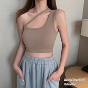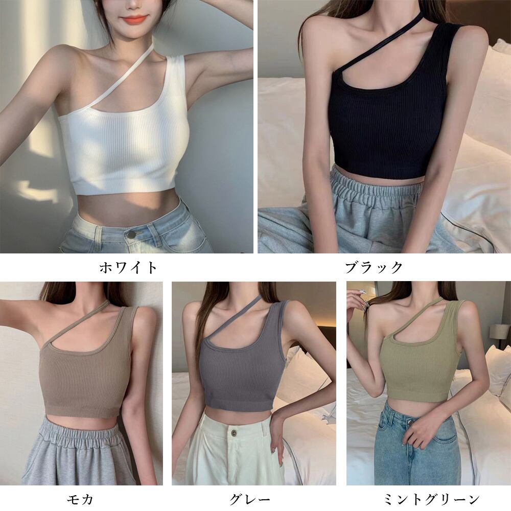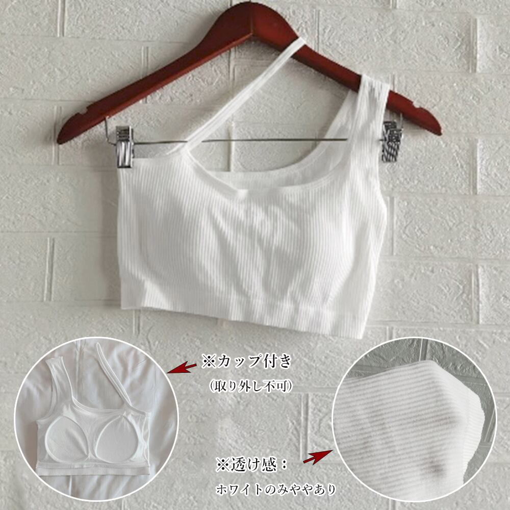 リブタンクトップ レディース 肩だし キャミソール ショート丈 ノンワイヤー スポーツブラ アシンメトリー 春夏