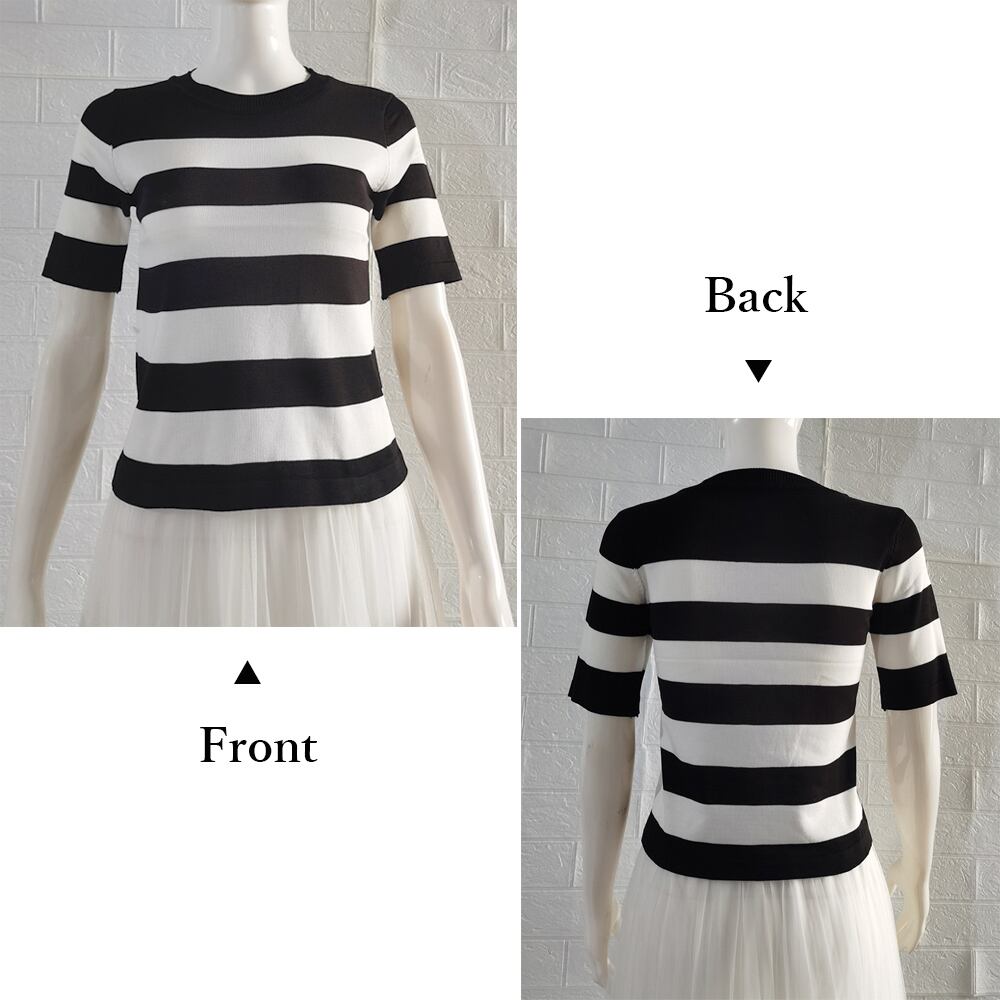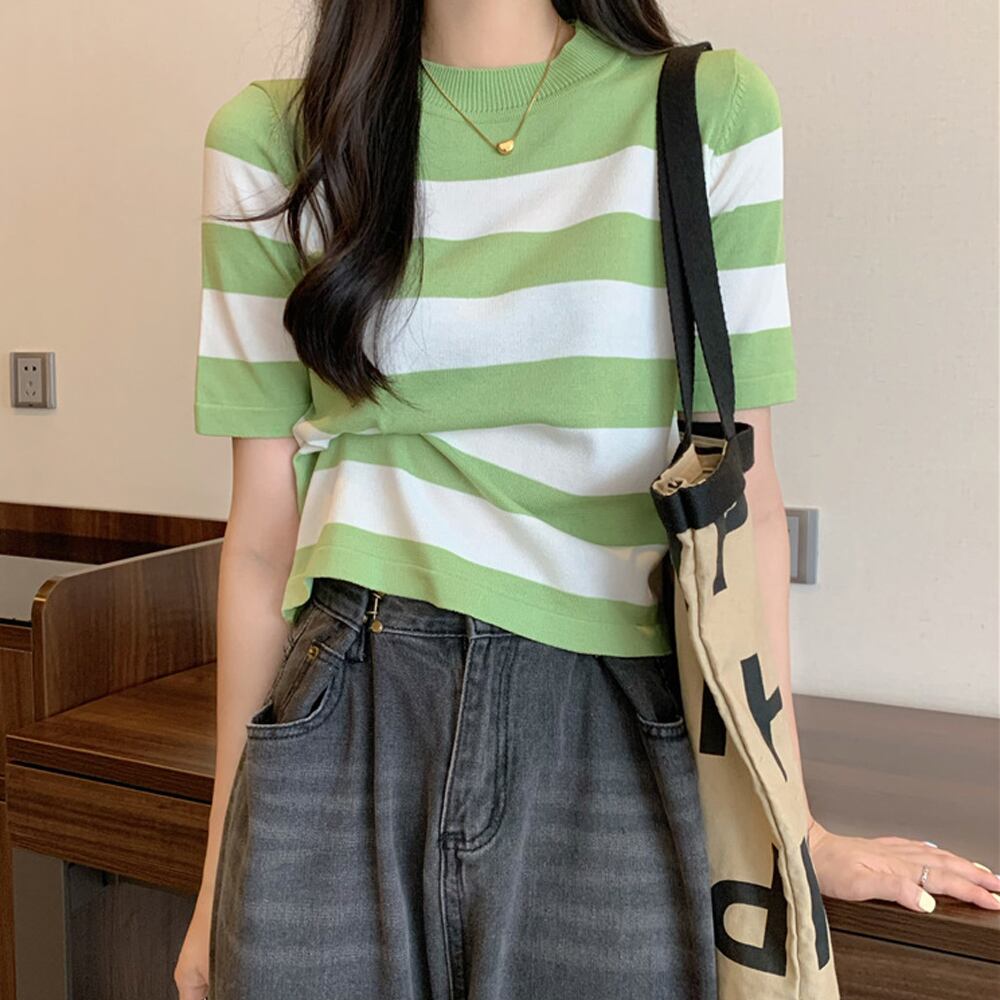 シンプルで合わせやすく定番のボーダー柄で飽きずに長く使える半袖ニットトップス