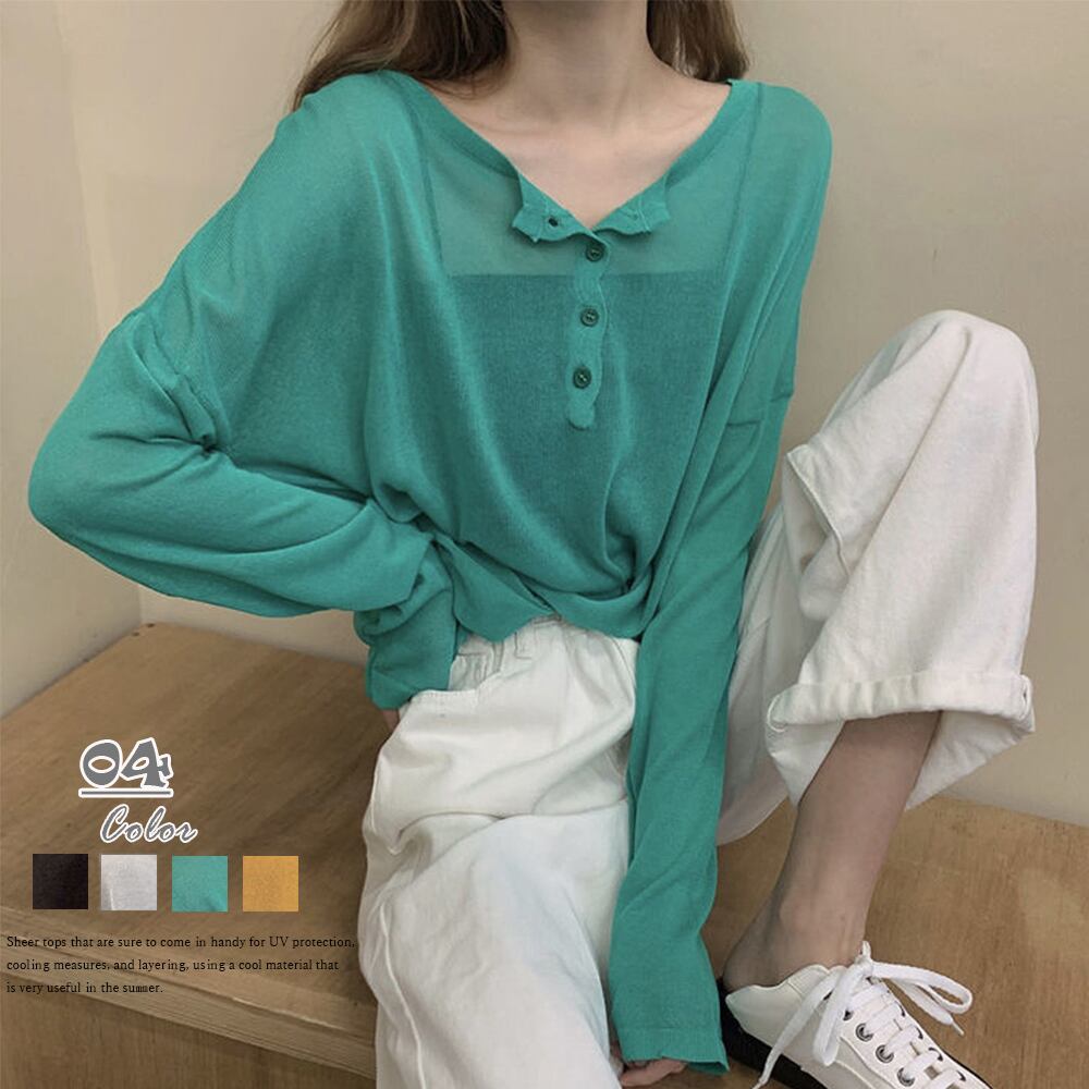 レディース 紫外線対策 ゆったり シアートップス フロントボタン ドロップショルダー透け感 薄手 プルオーバー