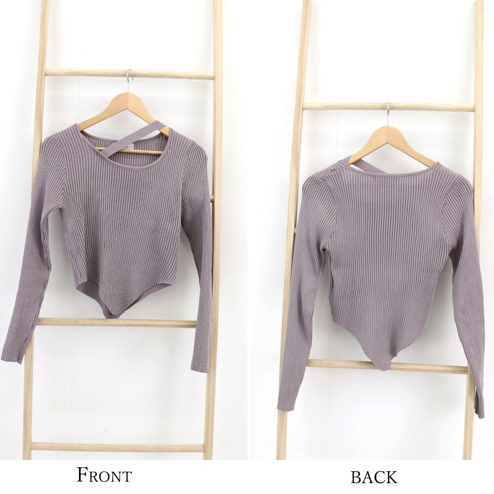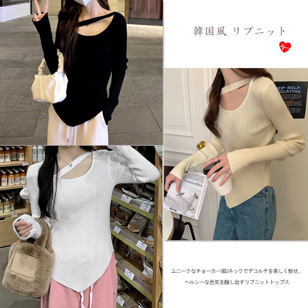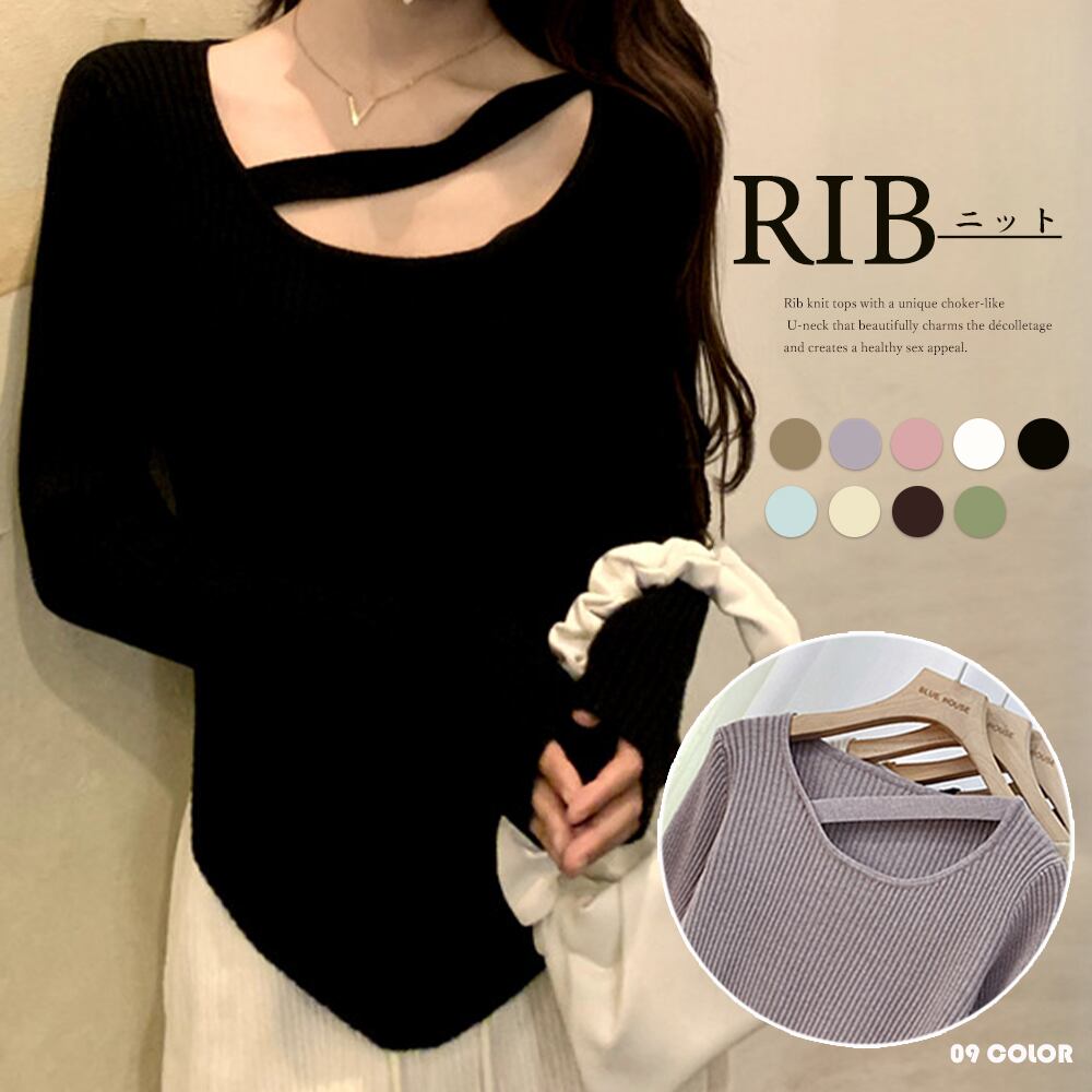 ユニークなチョーカー風Uネックでデコルテを美しく魅せ、ヘルシーな色気を醸し出すリブニットトップス