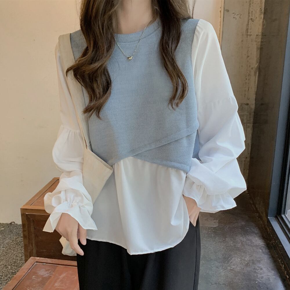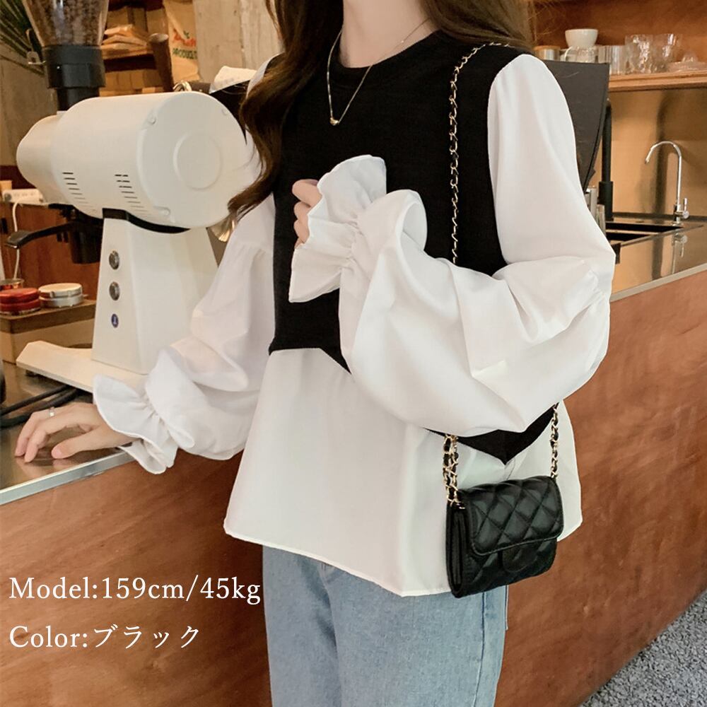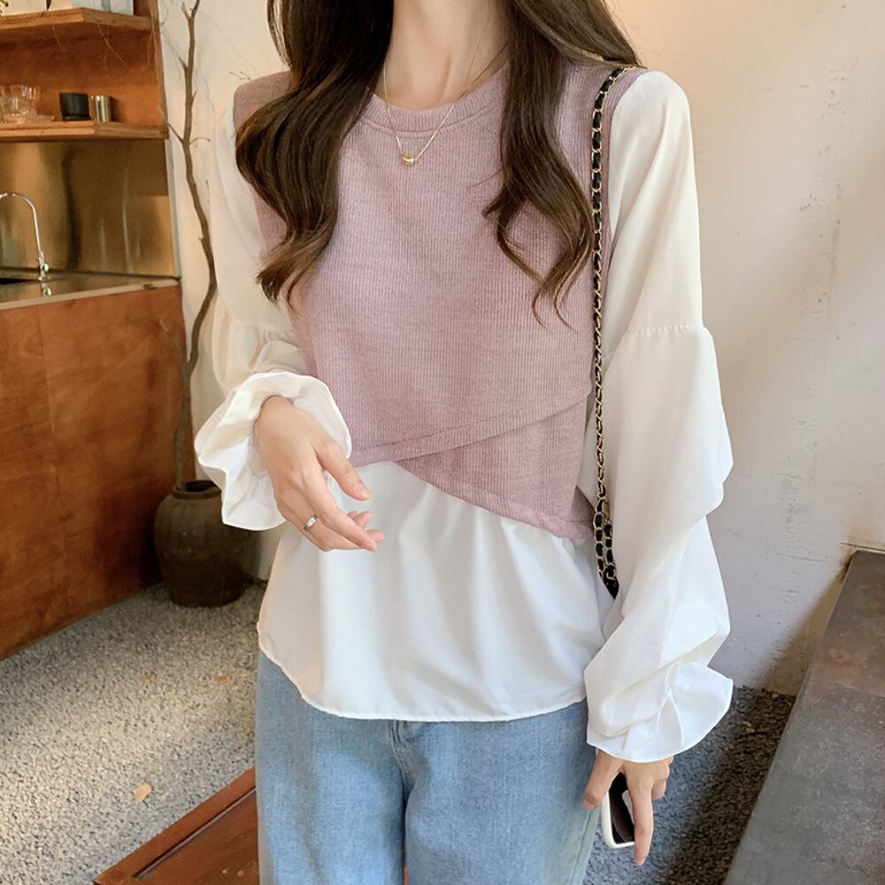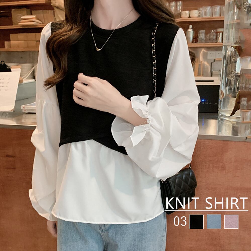シャツブラウス 重ね着風 韓国ファッション 切り替え ボリューム袖 レイヤードトップス ラウンドネック リブニット