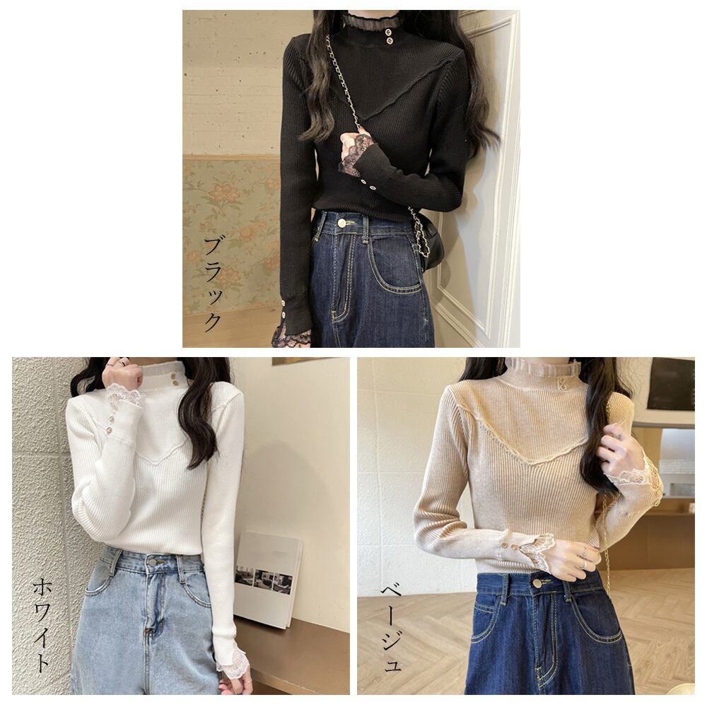 リブニット レディース レース ニットセーター インナー 長袖 ニットウェア ニットソー