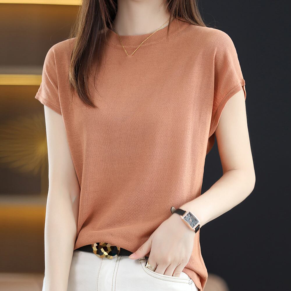 韓国 フレンチスリーブ ニットTシャツ 冷感タッチ 着やせ 30代40代通勤服 プチハイネック ニットトップス 春秋夏