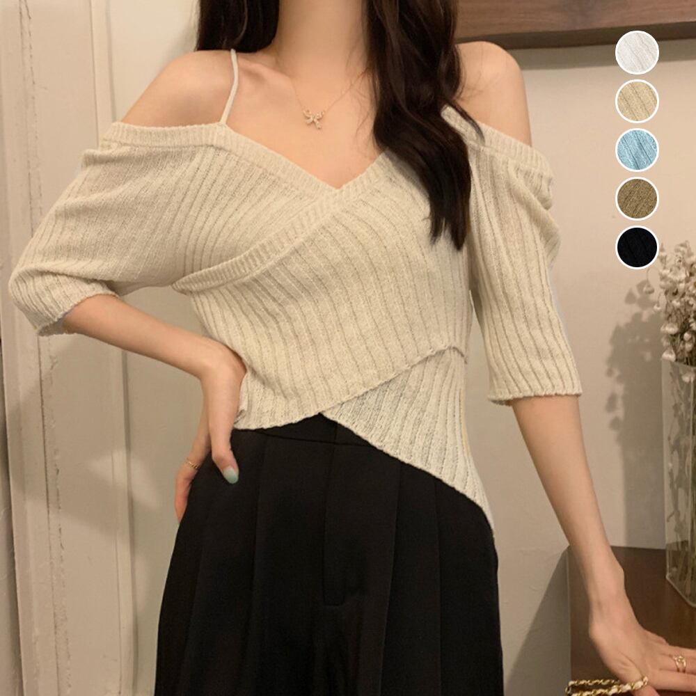 レディース 2wayクロスリブニット Vネック セクシーリブニット 無地 肩だしニット フィット感 ニットインナー 春夏