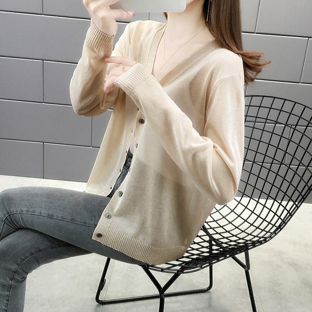 日焼け対策 薄手 ニットトップス 冷感タッチ オフィスカジュアル 羽織り 冷え対策 通学通勤 無地 vネックニット 長袖