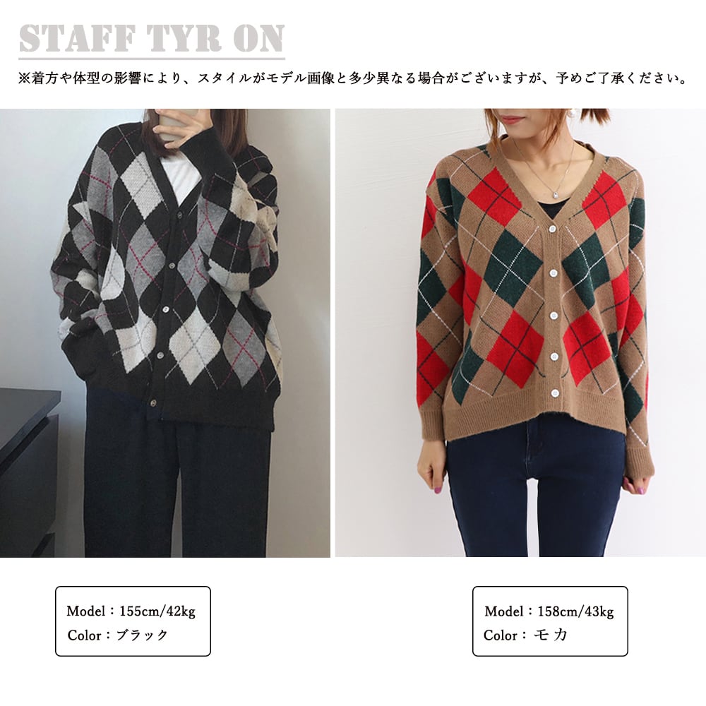 レディース Vネック 長袖 ジャガードニットカーディガン 配色 羽織り 前開き トップス はおり 通学通勤 韓国風 秋服ニット アウター柄 秋冬大人カジュアル アーガイルセーター女性らしい綺麗なシルエットを演出してくれるアーガイル柄カーディガン。深めのVネックデザインは首回りもすっきりと見せてくれて、ハイネックでもクルーネックでもインナーを選ばず相性ばっちり。ワイドパンツとスキニーデニムと合わせてはもちろん、プリーツミニスカートに合わせてもバランスよく、大人っぽさのでるコーデに。素材:ポリエステル75%+アクリル25%カラー:ブラック/モカ/グリーン/ローズピンクサイズ:ワンサイズ着丈:約57cm 肩幅:約50cm 袖丈:約46cm ゆき:約71cm 身幅:約53cm 胸囲:約106-130cm裏地:なし伸縮性:あり透け感:なし生産国:中国※商品の細部仕様は多少異なる場合がございます。予めご了承の上、ご注文お願い致します。