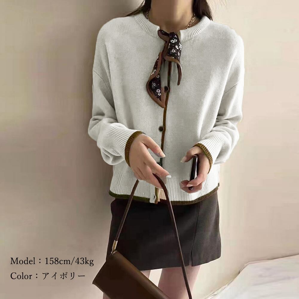 ボウタイ リボン カーディガン オフィスカジュアル 秋冬 前開き トップス 長袖 きれいめ ショートカーディガン 羽織エレガントトップス お洒落カーディガン 通勤 服 高見えシンプルの無地生地に配色ラインを加えてボウタイスカーフをプラス、カジュアルながらも上品に仕上げたニットカーディガンルーズ過ぎず程よくゆったりフィットシルエットが快適な着心地を実現、普段着でもオフィスコーデでも使いやすいシックな1枚閉じたり開けたりできるボタン開閉仕様なので、寒くなるこれからの季節ではトップスとして着るのはもちろん、春先になると薄手インナーの上にサラッと羽織るのもおすすめ本体素材:ポリエステル75%+アクリル25%別布素材:ポリエステル100%カラー:ブラック/ブラウン/アイボリー/レッドサイズ:ワンサイズ着丈:約56cm 肩幅:約54cm 袖丈:約48cm ゆき約75cm 身幅:約53cm 胸囲:約106-150cm裏地:なし伸縮性:あり透け感:なし生産国:中国※商品の細部仕様は多少異なる場合がございます。予めご了承の上、ご注文お願い致します。