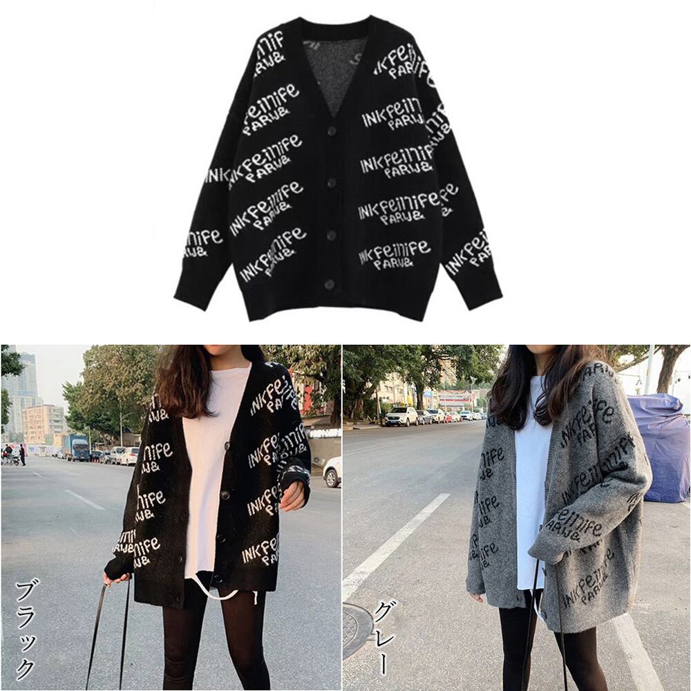 洗える 中厚手ニットアウター Vネックニット羽織り ロゴ 長袖体型カバートップス ドロップショルダー 暖かい上着 お洒落着やせニットカーデ ミドル丈ニット大人 ストリート系ニット今年大注目の存在感のある英字ロゴニットカーディガン。大胆に施された英字ロゴが目を惹きつつも、ゆったりとしたデザインが大人カジュアルな印象に。ドロップショルダーでストリート感をプラス。スキニーデニムとレギンスはもちろん、シンプルなロングスカートとも相性抜群。素材:アクリル100%カラー:ブラック/グレーサイズ:ワンサイズ着丈:約65cm 肩幅:約61cm 袖丈:約45cm ゆき:約75.5cm 身幅:約58cm 胸囲:約116-140cm裏地:なし伸縮性:あり透け感:なし生産国:中国※商品の細部仕様は多少異なる場合がございます。予めご了承の上、ご注文お願い致します。
