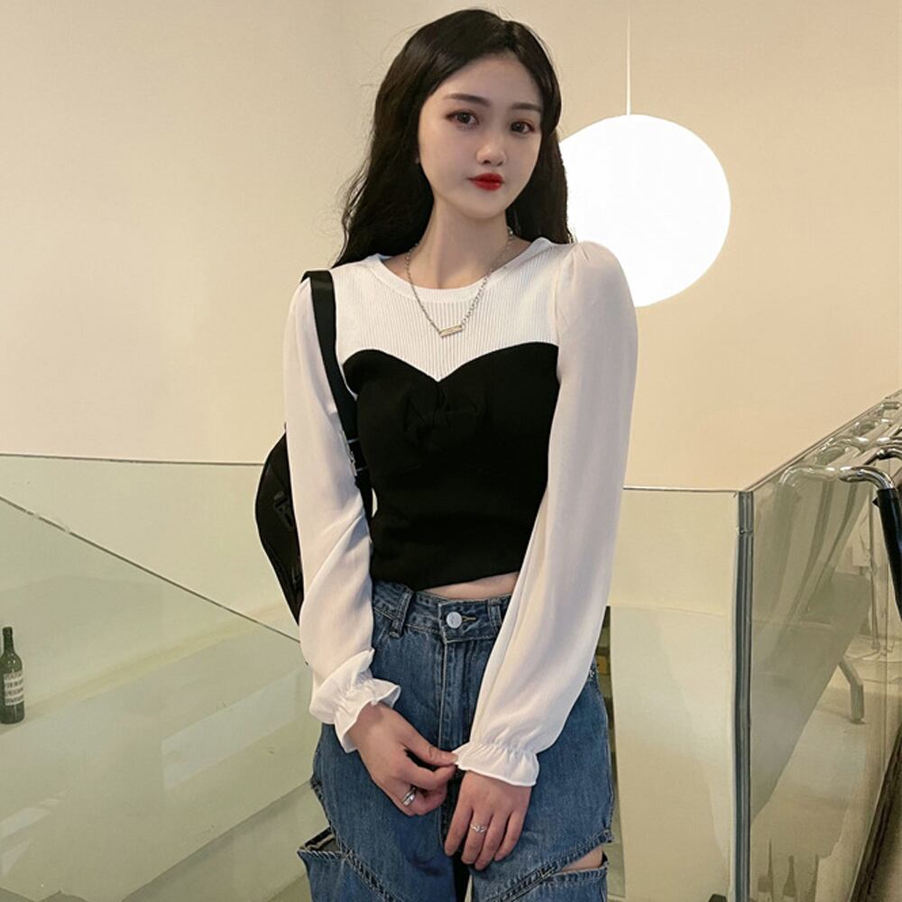 ショット丈トップス 袖シフォン ラウンドネック 切り替え ブラウス 異素材 長袖リブニット 着やせ 透け感 かわいい プルオーバー 秋冬アームの切り替えに十分なタックを加えることで自然なボリューム感に身頃は伸縮性があり、インスタイルもしやすいフェミニンなスカートとのコーディネートはもちろん、シンプルなデニムアイテムとの相性も抜群素材:ポリエステル75%+アクリル25%カラー:ブラック/スカイブルーサイズ:ワンサイズ着丈:約41cm 肩幅:約28cm 袖丈:約56cm ゆき:約70cm 身幅:約32cm 胸囲:約64-86cm裏地:なし伸縮性:身頃のみあり透け感:袖あり/白色部分ややあり生産国:中国※商品の細部仕様は多少異なる場合がございます。予めご了承の上、ご注文お願い致します。