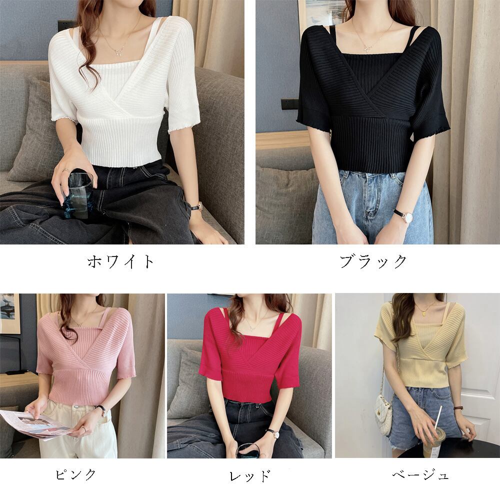 カシュクール ニットトップス バックリボン きれいめ ニットソー 半袖 ショート丈バックシャンニット 体型カバーニット 重ね着風トップスインナーキャミをレイヤードしたようなドッキングニットが登場バックに取り入れたキュートなリボンデザインで後ろからの視線もしっかり受け止めるメリハリのある女性らしいシルエットやデコルテを綺麗に魅せるネックカットなど大人カジュアルには最適な1枚素材:ポリエステル65%+綿35%カラー:ブラック/ホワイト/ベージュ/ピンク/レッドサイズ:ワンサイズ着丈:約42cm ゆき:約41cm 身幅:約33cm 胸囲:約66-102cm裏地:なし伸縮性:あり透け感:ホワイトのみややあり生産国:中国※商品の細部仕様は多少異なる場合がございます。予めご了承の上、ご注文お願い致します。