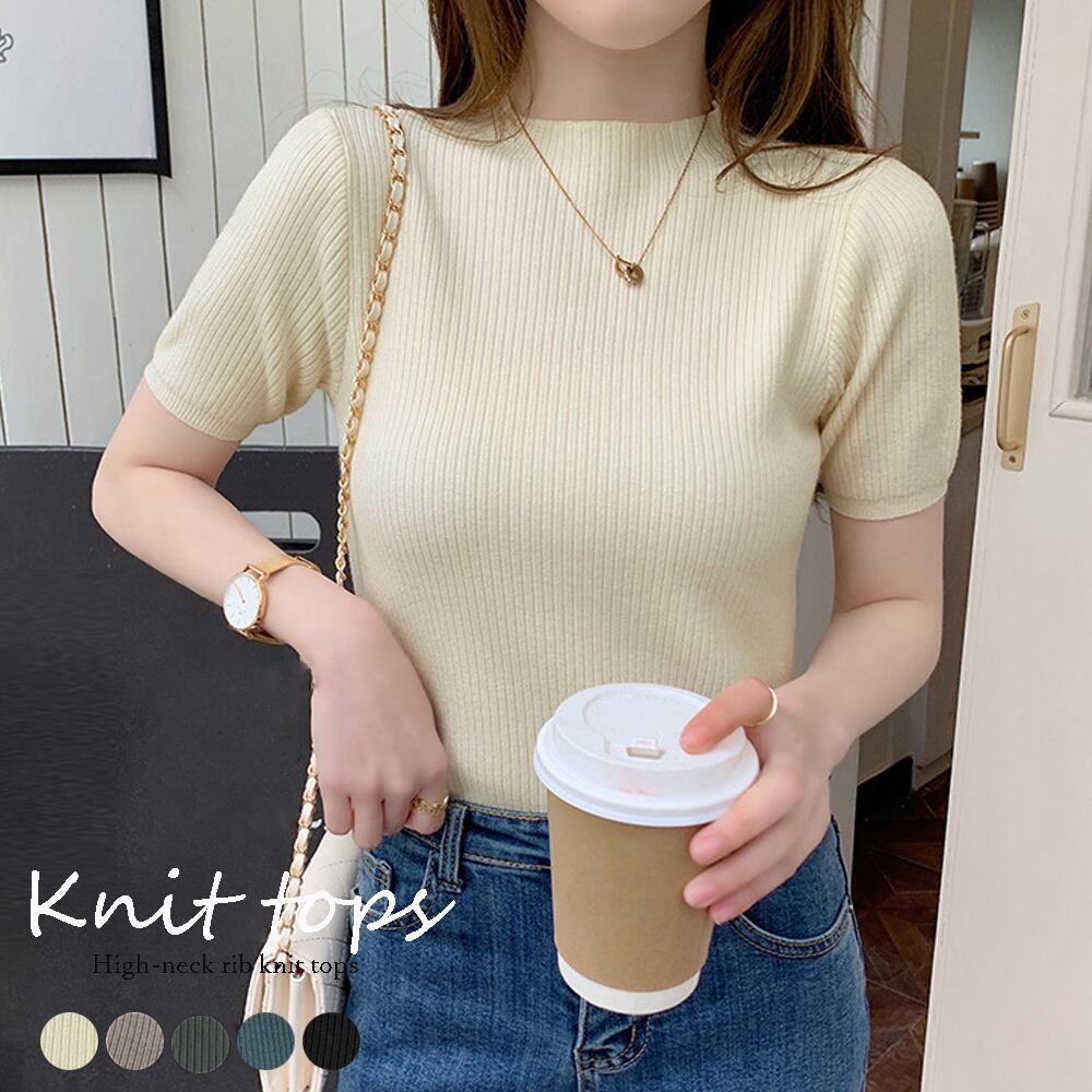 リブ タイトニット トップス レディース 半袖 ニットソー プルオーバー