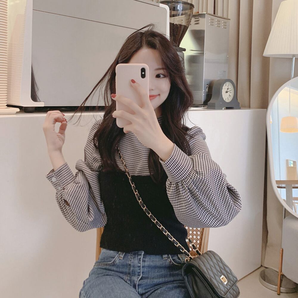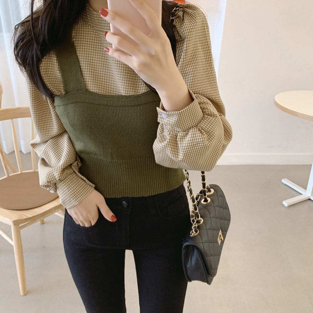 ニットキャミソール ブラウス2点セット レディース チェック柄 長袖シャツ