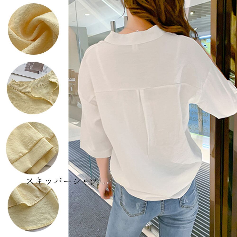 大人可愛いスキッパーシャツです若干長めの五分袖なので、二の腕隠しにも最適、またオフィスで肌寒い時に大活躍デイリーユース、オフィスコーデにも着用できるシンプルなデザインで一枚あれば重宝すること間違いなし首元はVネックデザインになっているので着やせ効果も抜群ですカラー:ホワイト/ミントグリーン/ピンク/薄イエロー素材:ポリエステル70%+綿30%サイズ:ワンサイズ着丈:約71cm 肩幅:約56cm 袖丈:約27cm ゆき:約55cm 身幅:約53cm 胸囲:約106cm裏地:なし伸縮性:なし透け感:若干あり生産国:中国※商品の細部仕様は予告なく変更になる場合がございます。交換/返品対象外になりますので、ご了承下さい。※ワンサイズ商品にタグが付いても商品とは関係ございません。ご了承くださいませ。