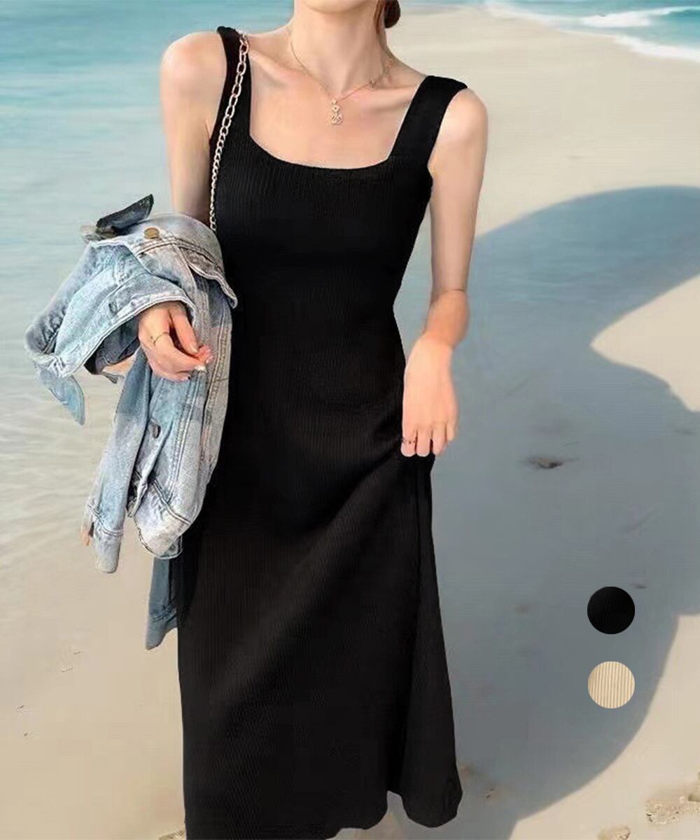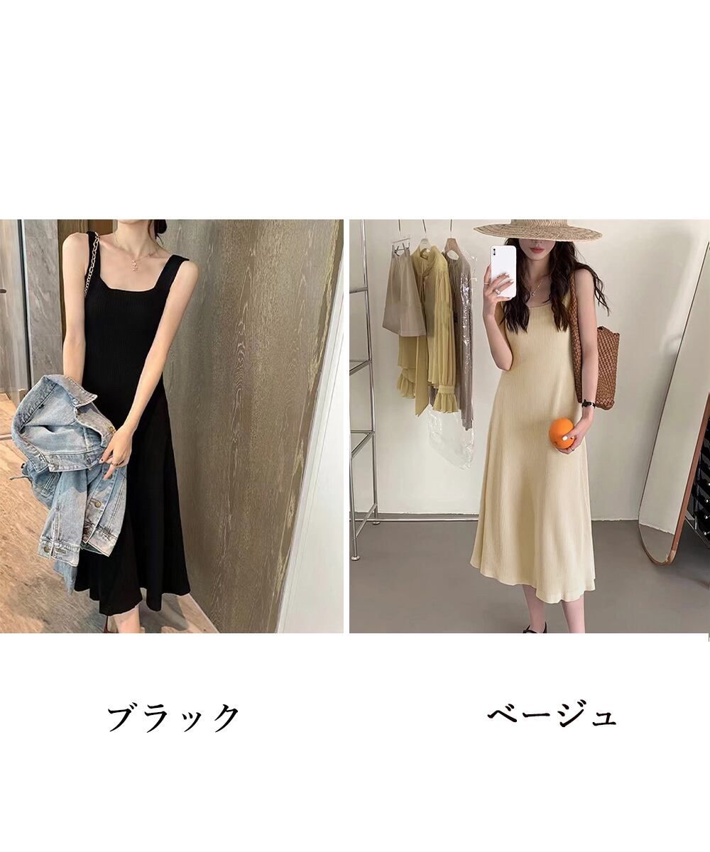 ニットキャミワンピース レディース Aラインワンピース ノースリーブ 無地 ロングワンピース 着やせフレアワンピ 春夏秋韓国風 オルチャン ワンピース 着やせ 重ね着ワンピース黒シンプルなデザインが大人の雰囲気を醸し出す上品なAラインタンクワンピーススクエアネックがデコルテラインを綺麗に見せて、顔周りをすっきりとしたシルエットにしてくれる一枚でそのまま着るのもかわいいアイテムですが、シャツやジャケット、コートと合わせてトレンド感を取り入れた着こなしもおすすめ素材:ポリエステル75%+アクリル25%カラー:ブラック/ベージュサイズ:ワンサイズ総丈:約101cm 身幅:約36cm 胸囲:約72-120cm ウエスト:約72-120cm ヒップ:約92-140cm裏地:なし伸縮性:あり透け感:ベージュのみややあり※ニット素材の為、伸縮具合によっては編みに隙間を感じる場合があります。生産国:中国※商品の細部仕様は多少異なる場合がございます。予めご了承の上、ご注文お願い致します。