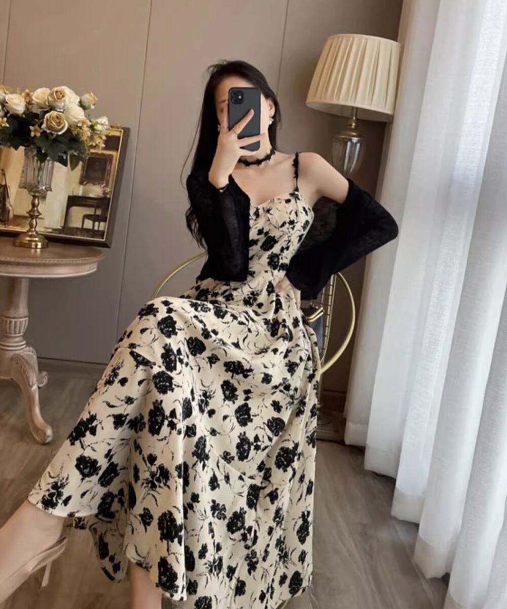レディース サマーセットアップ 花柄ワンピース 冷房対策カーディガン リゾートワンピ 韓国風ノースリーブワンピ 夏羽織り夏ワンピース着やせ フレアロングワンピ ニットボレロ 春夏花柄のキャミワンピースと黒のカーディガンのセットアップワンピースはハイウエスなので、体型をカバーしながらメリハリのあるシルエットを演出してくれるそれぞれ別々でもコーディネートしやすいので、着回ししやすいセットカーディガン素材:ポリエステル100%ワンピース素材:ポリエステル100%カラー:ベージュ×ブラックサイズ:M/L/XLカーディガン着丈:約27/29/30cm 肩幅:約33/35/37cm 袖丈:約56/57/58cm ゆき:約72.5/74.5/76.5cm 身幅:約44/47/50cm 胸囲(全サイズ):フリーワンピース総丈(調節不可):約115/115/115cm 身幅:約35/36/37cm 胸囲(シャーリング仕様):約70-90/72-95/74-100cm ウエスト:約67/70/73cm ヒップ:約100/105/110cm裏地:なし伸縮性:トップスあり、ワンピースのシャーリング部分あり透け感:なし生産国:中国※商品の細部仕様は多少異なる場合がございます。予めご了承の上、ご注文お願い致します。