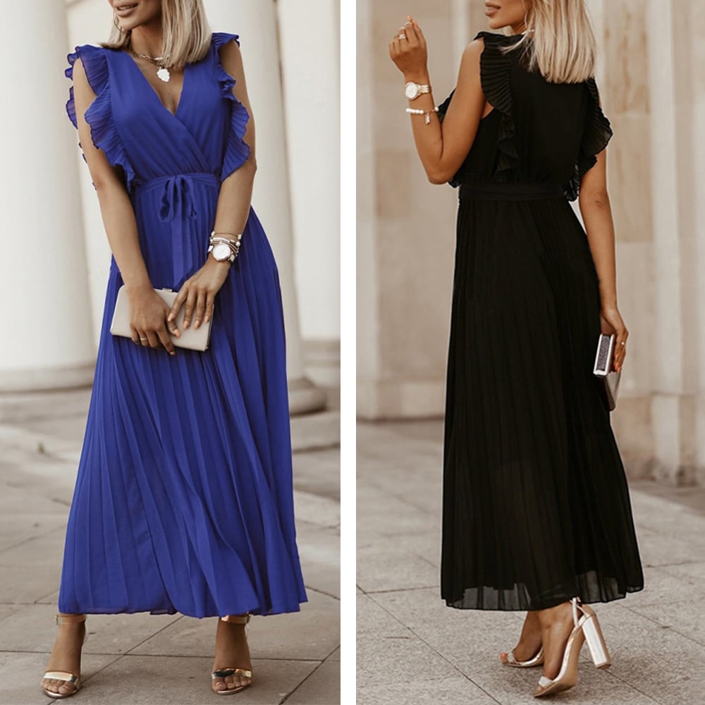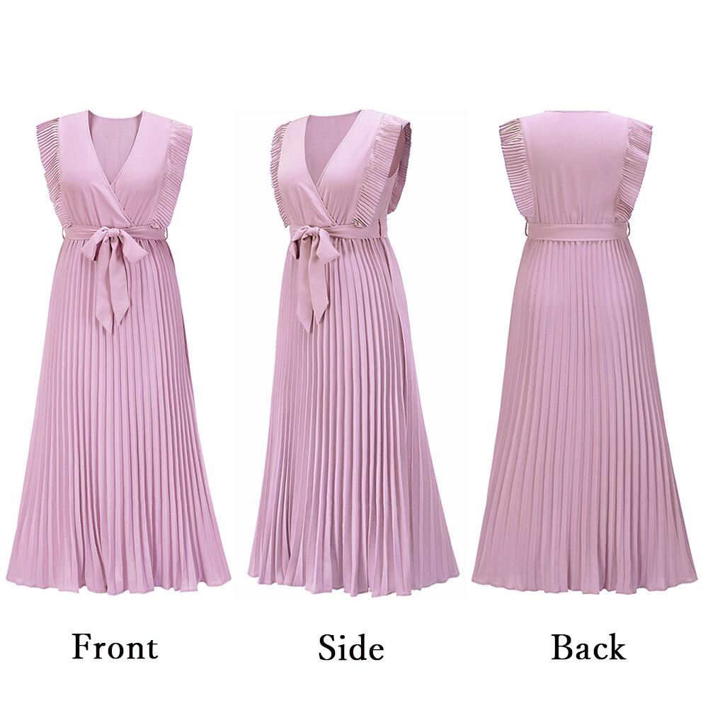 フレアスリーブ シフォンワンピ Vネック Aライン マキシワンピースドレス ウエストマーク 海リゾートワンピ 体型カバーサマーワンピース白 結婚式マキシワンピ セクシー胸元ワンピ上品で優雅な印象を与えるプリーツロングワンピース。フレアスリーブが二の腕のラインを綺麗に見せ、女性らしい印象をアップ。ロング丈で気になる体型をすっぽりカバーして、付属のリボンベルトを絞ってメリハリをつけ脚長こうかもバツグン。生地はさらりとしたシフォン素材を使用しており、着心地が快適♪パーティードレス、結婚式のドレスとしてはもちろん、イベントなどのキャバドレスとしてもおすすめ。素材:ポリエステル100%カラー:ブラック/ホワイト/グリーン/ワインレッド/ラベンダー/ロイヤルブルーサイズ:S/M[S]総丈:約145cm 肩幅:約31cm 袖丈:約7cm ゆき:約22.5cm 身幅:約45cm 胸囲:約90cm ウエスト(ゴム仕様):約66-96cm ヒップ:約140cm[M]総丈:約147cm 肩幅:約32cm 袖丈:約7cm ゆき:約23cm 身幅:約49cm 胸囲:約98cm ウエスト(ゴム仕様):約68-98cm ヒップ:約144cm裏地:なし伸縮性:なし透け感:淡色のみ若干あり生産国:中国※商品の細部仕様は多少異なる場合がございます。予めご了承の上、ご注文お願い致します。