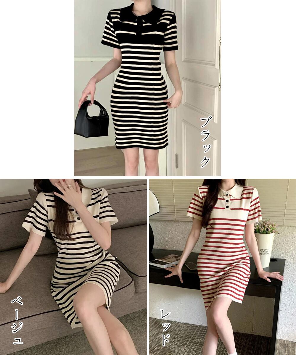 レディース 襟付き タイトワンピース 着やせ サマーニットワンピース おしゃれ カジュアル 細見え春夏ワンピース 韓国風細身膝上ワンピース 半袖ミニワンピース 着回しニットワンピ体にぴったりフィットして、ボディラインを魅せるボーダー柄ニットワンピースポロシャツ襟のデザインは優しくて上品な雰囲気を演出する1枚でさらっと着やすいカジュアルワンピースは春夏大活躍間違いなし素材:ポリエステル75%+綿25%カラー:ブラック/ベージュ/レッドサイズ:ワンサイズ総丈:約82cm 肩幅:約36cm 袖丈:約16cm ゆき:約34cm 身幅:約44cm 胸囲:約88-145cm ウエスト:約80-135cm ヒップ:約84-145cm裏地:なし伸縮性:あり透け感:なし生産国:中国※商品の細部仕様は多少異なる場合がございます。予めご了承の上、ご注文お願い致します。