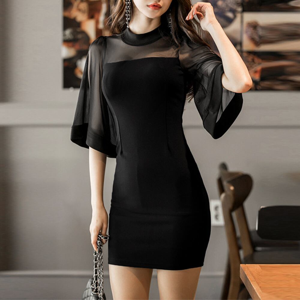 ボディコンワンピース フレアスリーブ 無地 ミニ丈クラブドレス 安いナイトドレス ハイウエスト 胸元シースルーワンピース