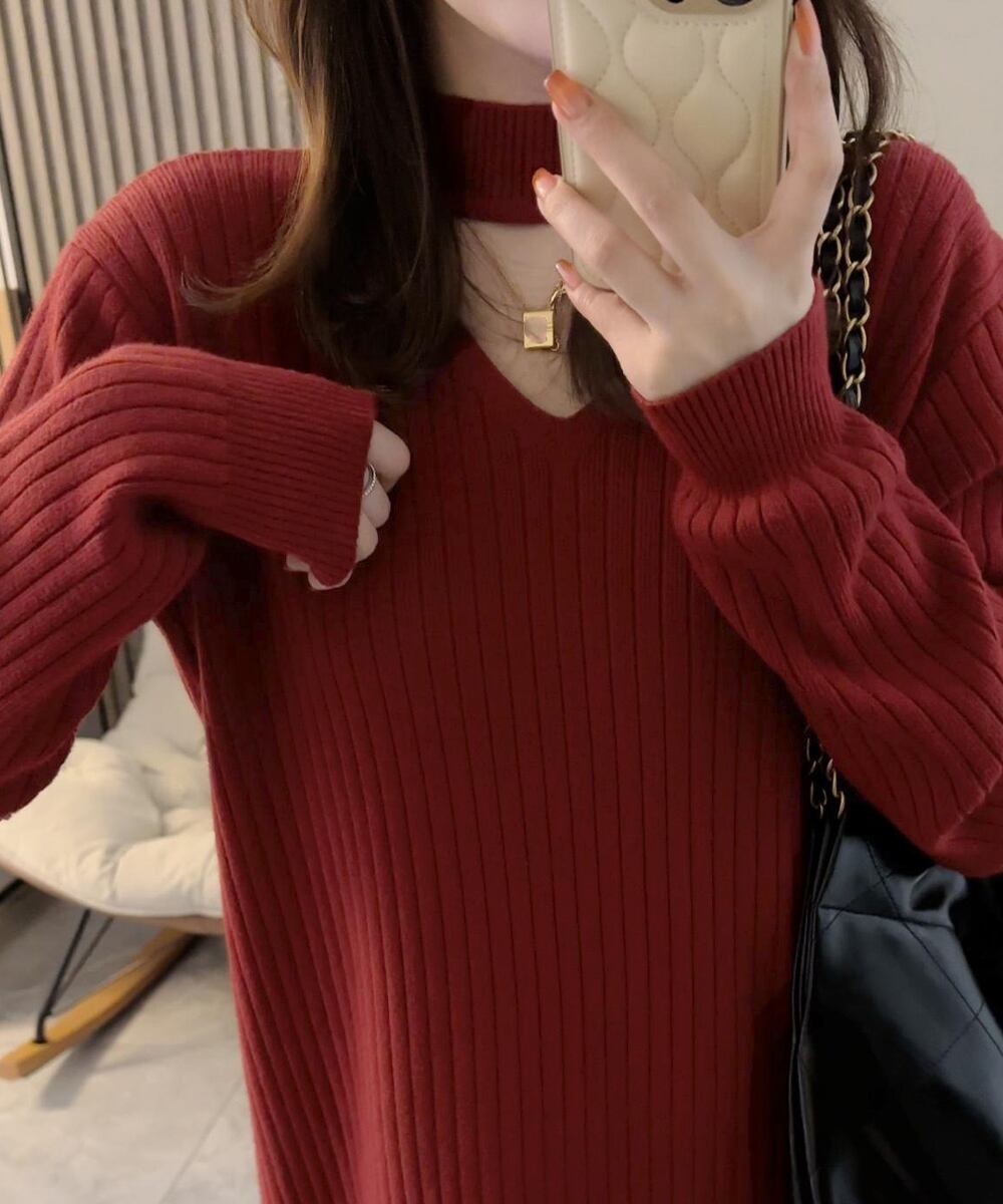韓国 レディース きれいめカジュアル 秋冬チョーカー風ワンピース 無地ホルターネックワンピース 長袖 ゆったり体型カバー