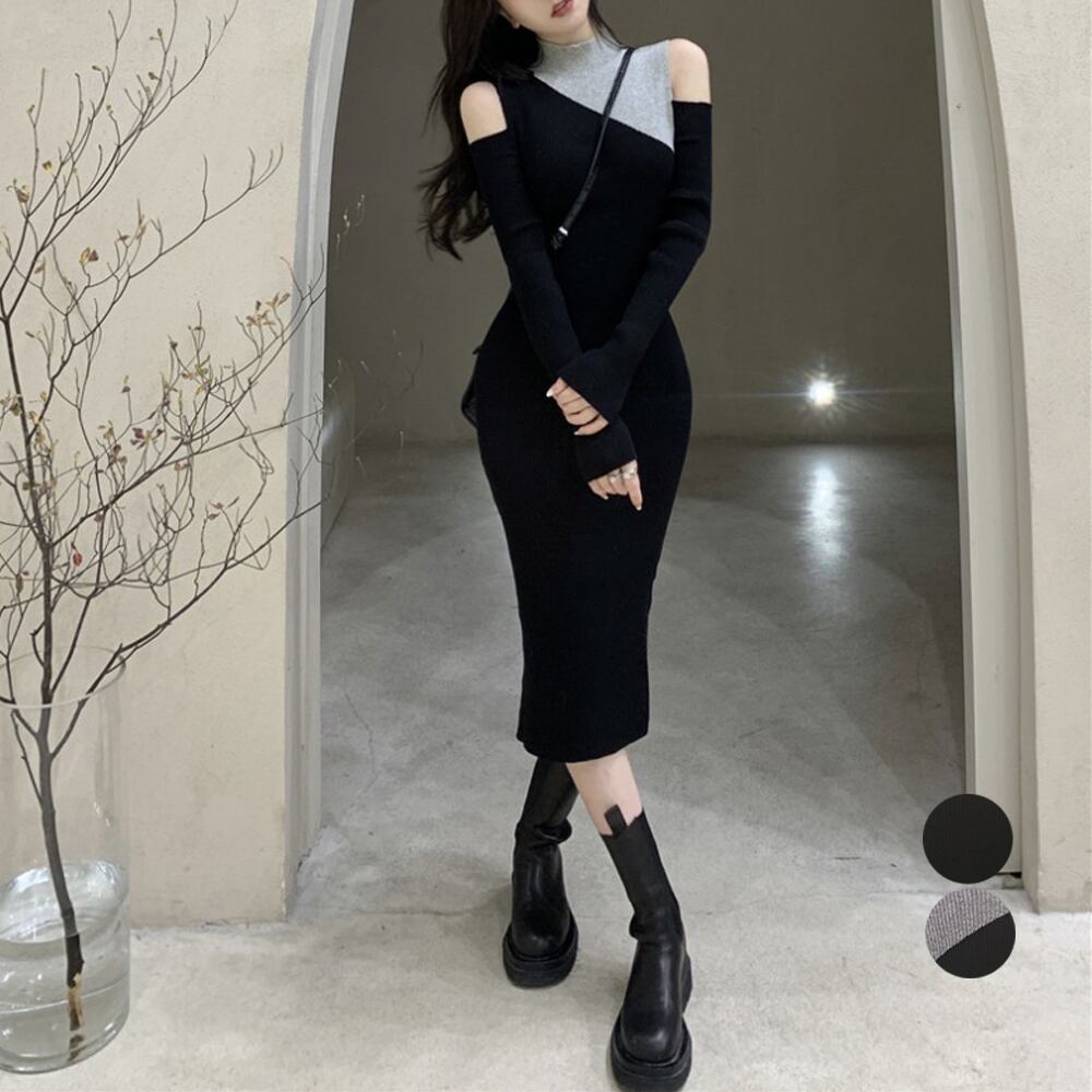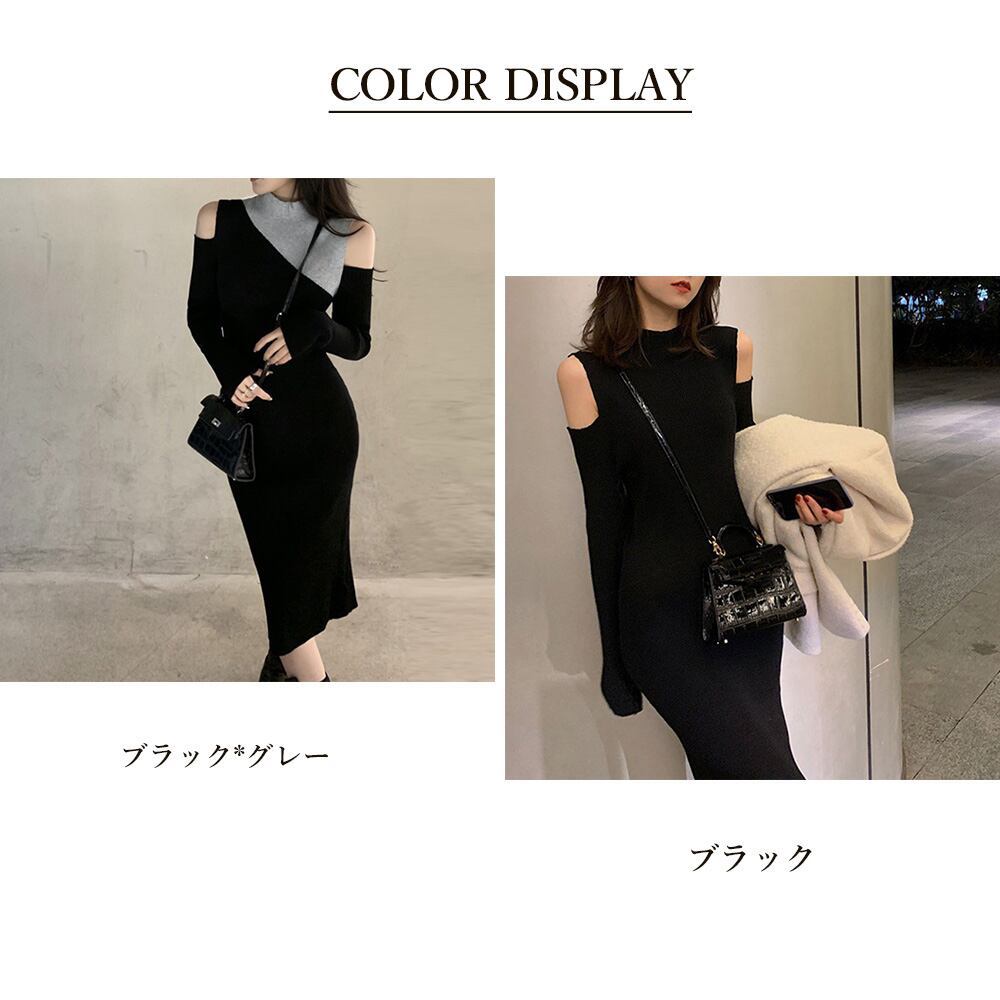 前後2way ニットワンピ リブニット ロングワンピ フェミニン フィット感 秋冬 肌魅せ 大人カジュアルきれいめワンピ肩開きニットロング セクシー黒 韓国風 ショルダーカット秋しっかり長さのあるロング丈と程よいフィット感で上品に仕上げたリブニットワンピース 伸縮性があり着心地の良いニット素材に肩出しのデザインで、女性らしく程よい肌魅せができるシンプルながらオシャレ見えする1枚、すっきりとした大人っぽいスタイリングにぴったりのアイテム素材:ポリエステル70%+アクリル30%カラー:ブラック/ブラック*グレーサイズ:ワンサイズ総丈:約108cm 肩幅:約28cm 袖丈:約50cm ゆき:約64cm 身幅:約35cm 胸囲:約70-104cm ウエスト:約62-100cm ヒップ:約62-100cm裏地:なし伸縮性:あり透け感:なし生産国:中国※商品の細部仕様は多少異なる場合がございます。予めご了承の上、ご注文お願い致します。
