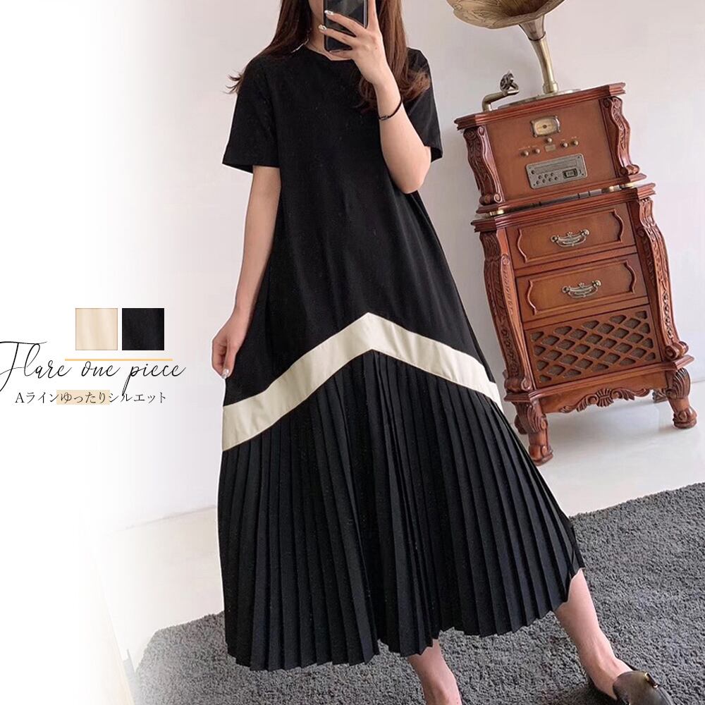 ロング ワンピース レディース プリーツ切り替え 夏 マキシワンピース 半袖 Aライン ワンピース 体型カバー ゆったりTシャツワンピース ミモレ丈ワンピ春夏 ドッキングワンピコーデに迷ったときにさっと着られて便利なプリーツ切り替えワンピースですゆったりと着られて体型をしっかりカバーしてくれますスニーカーやブーツと合わせることで、ドレッシーすぎない装いになります素材:綿65%ポリエステル35%カラー:ベージュ/ブラックサイズ:ワンサイズ総丈:約110cm 肩幅:約36cm 袖丈:約22cm ゆき:約40cm 身幅:約48cm 胸囲:約96-120cm ウエスト:約110cm ヒップ:約120cm裏地:なし伸縮性:あり透け感:ベージュのみややあり生産国:中国※商品の細部仕様は多少異なる場合がございます。予めご了承の上、ご注文お願い致します。