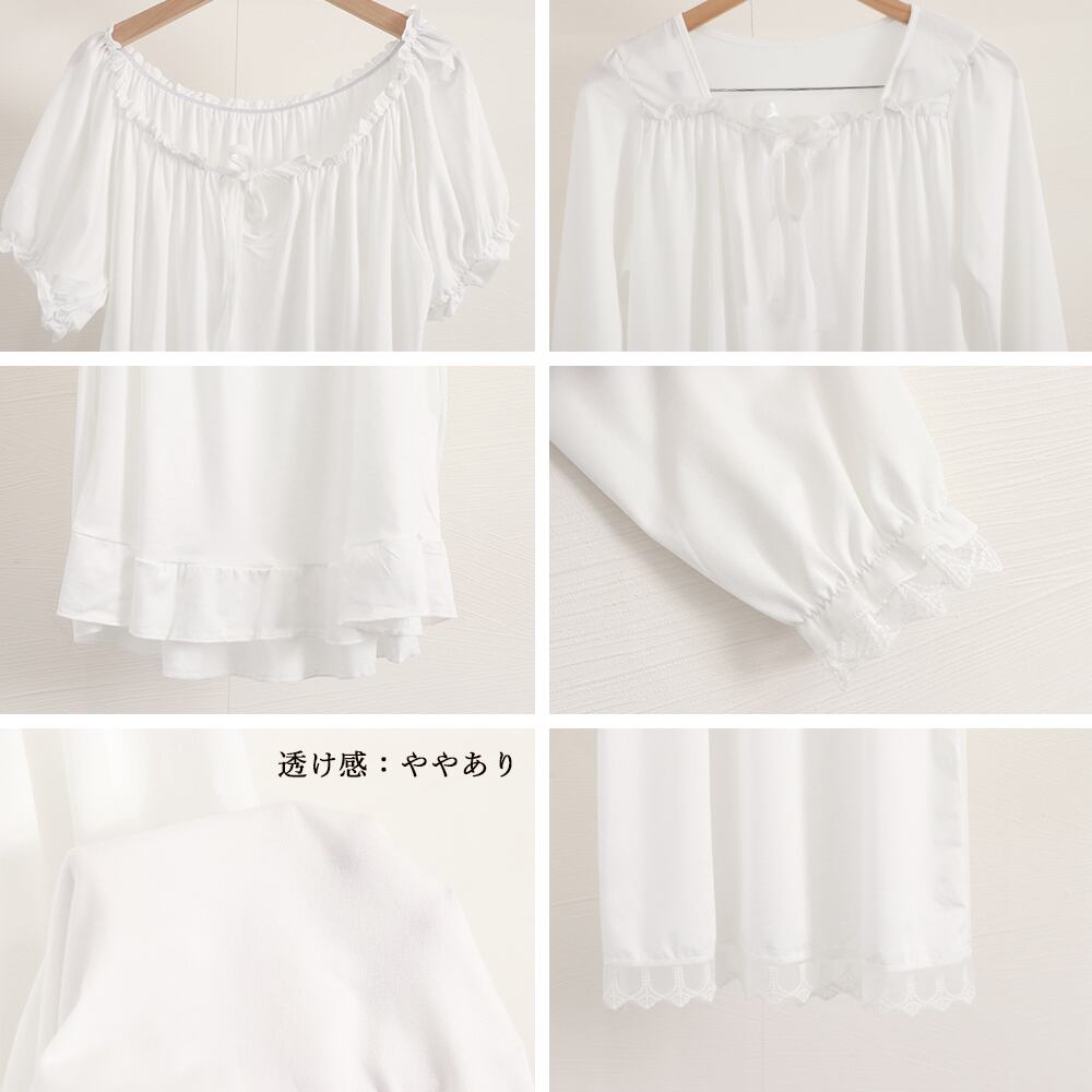 袖口と裾にフリルがあしらわれ、かわいらしい印象を与えます