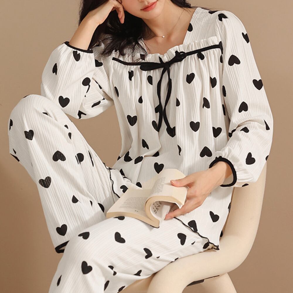 お家のリラックスタイムでも可愛くいたい女性のワガママを実現するリボン付きタック入りフリル襟の部屋着2点セット