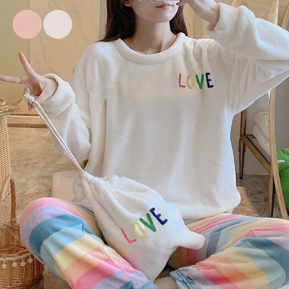 ボアルームウェアセットアップ レインボー色 部屋着 秋冬長袖 もこもこ 暖かい寝巻き韓国ふわふわ ナイトウェア上下セット