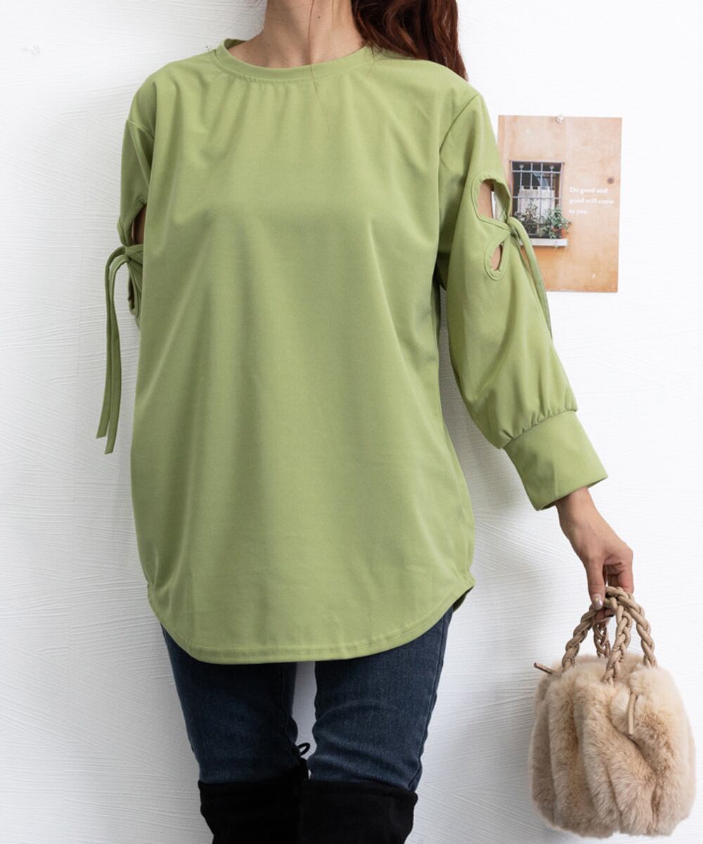 レディース 体型カバー ロングTシャツ クルーネック 春秋 カジュアル プルオーバー 無地 大人可愛い ロンティー韓国ファッション tシャツ 通勤通学 薄手カットソー袖のリボンデザインが、さりげなくおしゃれな雰囲気をプラスするTシャツカットソーゆったりとしたシルエットで体型をカバーし、気になる腰まわりもさりげなく隠せる定番のデニムスキニーパンツと合わせれば、リラックス感のあるスタイリングが完成する素材:ポリエステル100%カラー:ブラック/ホワイト/モカ/マスタード/グリーン/ピンクサイズ:ワンサイズ着丈:約73cm 肩幅:約48cm 袖丈:約49cm ゆき:約73cm 身幅:約56cm 胸囲:約112cm裏地:なし伸縮性:なし透け感:ホワイトのみややあり生産国:中国※すべて平置きサイズです(採寸方法違いより、多少の誤差がございますので、ご了承ください)。※海外輸入品のため、商品の細部仕様は多少異なる場合がございます。予めご了承の上、ご注文お願い致します。