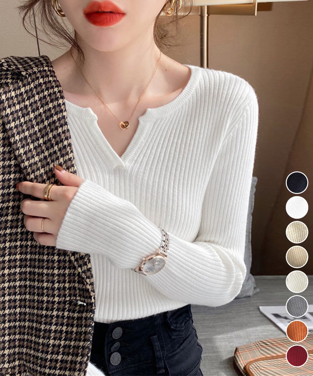 ニットセーター レディース タイトニット 大人可愛い 着回しニットインナー ベーシックニット きれいめ 春秋冬服 着やせニットプルオーバー リブニットおしゃれ 女性ニットソー無地着回し抜群のリブニットプルオーバーが今季も登場Vネックデザインで首元がすっきりと美しく見えるほどよくフィットするシルエットがフェミニンなスタイルを演出ボトムスを選ばずにコーディネートが決まるアイテムで、そのまま着るもよし、アウターのインナーとして着るもよし。ロングシーズンで大活躍間違いなし素材:ポリエステル75%+アクリル25%カラー:ブラック/ホワイト/ライトベージュ/ベージュ/アイボリー/ダークグレー/オレンジ/ワインレッドサイズ:ワンサイズ着丈:約52cm 肩幅:約28cm 袖丈:約53cm ゆき:約67cm 身幅:約33cm 胸囲:約66-104cm裏地:なし伸縮性:あり透け感:淡色のみ若干あり※ニット素材の為、伸縮具合によっては編みに隙間を感じる場合があります生産国:中国※すべて平置きサイズです(採寸方法違いより、多少の誤差がございますので、ご了承ください)。※海外輸入品のため、商品の細部仕様は多少異なる場合がございます。予めご了承の上、ご注文お願い致します。