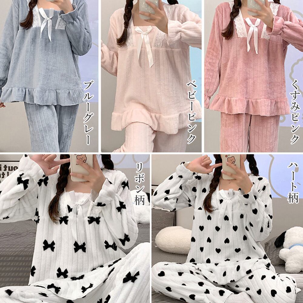 ふわふわパジャマ レディース 秋冬 暖かいルームウェア ラウンジウェア 女性 寝巻き 大人可愛い部屋着 長袖ナイトウェアガーリー パジャマ 修学旅行 パジャマ お泊りパジャマ旅行サラリと滑らかな薄手フリース生地を使用、ちくちくせずに暖かいのに蒸れないフェミニンテイストのセットアップルームウェア柄物と無地typeをご用意、レースとリボンのポイント付けによって、女性らしさを強調して引き立ててガーリー感満載お家でのリラックスタイムはもちろん、お泊りデートや女子会、出張や旅行にもおすすめのラウンジウェアトップスの素材:ポリエステル100%ボトムスの素材:ポリエステル100%カラー:ハート柄/リボン柄/くすみピンク/ベビーピンク/ブルーグレーサイズ:ワンサイズトップス:着丈:約66cm 肩幅:約46cm 袖丈:約56cm ゆき:約79cm 身幅:約58cm 胸囲:約116cmボトムス:着丈:約96cm 股下:約69cm ウエスト:約58-108cm(ゴム仕様) ヒップ:約114cm もも周り:約64cm裏地:なし伸縮性:なし透け感:なし生産国:中国※すべて平置きサイズです(採寸方法違いより、多少の誤差がございますので、ご了承ください)。※海外輸入品のため、商品の細部仕様は多少異なる場合がございます。予めご了承の上、ご注文お願い致します。