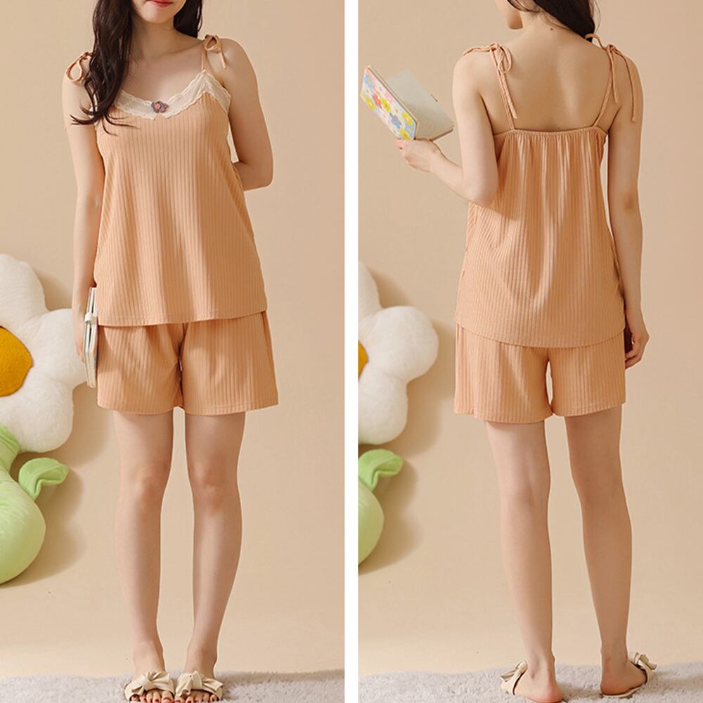 レディース 冷感タッチ キャミソール ショートパンツ 上下セット おしゃれ ナイトウェア 大人可愛い 部屋着 韓国寝巻き涼し気レース室内着 お泊り服キャミ薄手 ホームウェアセットさらっと生地が心地良いキャミ&ショートパンツの部屋着セットアップ肩紐は結んで調整するリボン仕様なので、幅広い身長の方に合わせることができ、顔まわりも華やかに見せてくれる2点セットでも、軽量だから荷物がかさばらず持ち運びやすい。旅行や、ちょっとしたお泊りにオススメ素材:ポリエステル70%+綿30%カラー:ブラック/アイボリー/くすみブルー/くすみオレンジ/モスグリーンサイズ:ワンサイズトップス:着丈(リボンにより調節可能):約75cm 身幅:約40cm 胸囲(後ろゴム仕様):約80-130cmボトムス:着丈:約40cm 股下:約12cm ウエスト(ゴム仕様):約62-120cm ヒップ:約114-150cm もも周り:約66-88cm裏地:なし伸縮性:あり透け感:アイボリーのみややあり生産国:中国※すべて平置きサイズです(採寸方法違いより、多少の誤差がございますので、ご了承ください)。※海外輸入品のため、商品の細部仕様は多少異なる場合がございます。予めご了承の上、ご注文お願い致します。