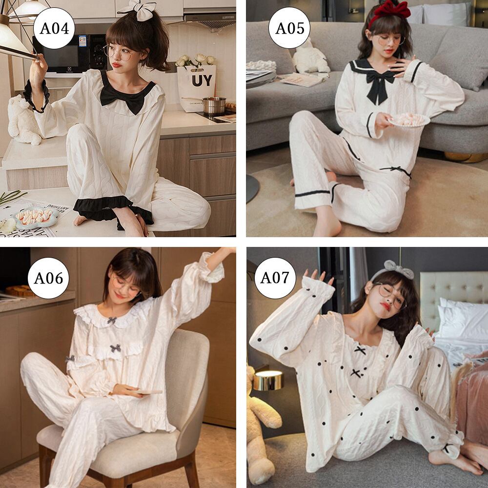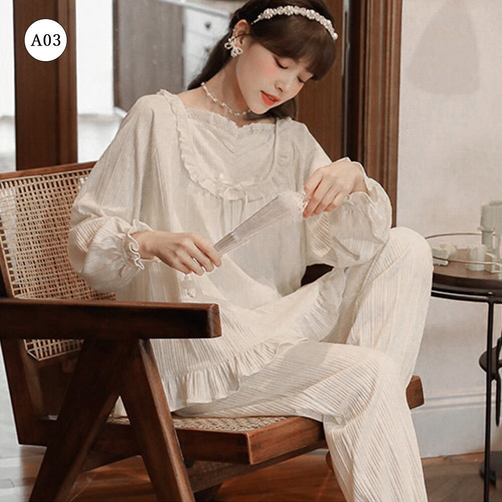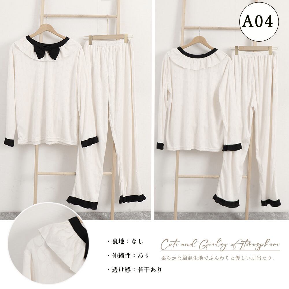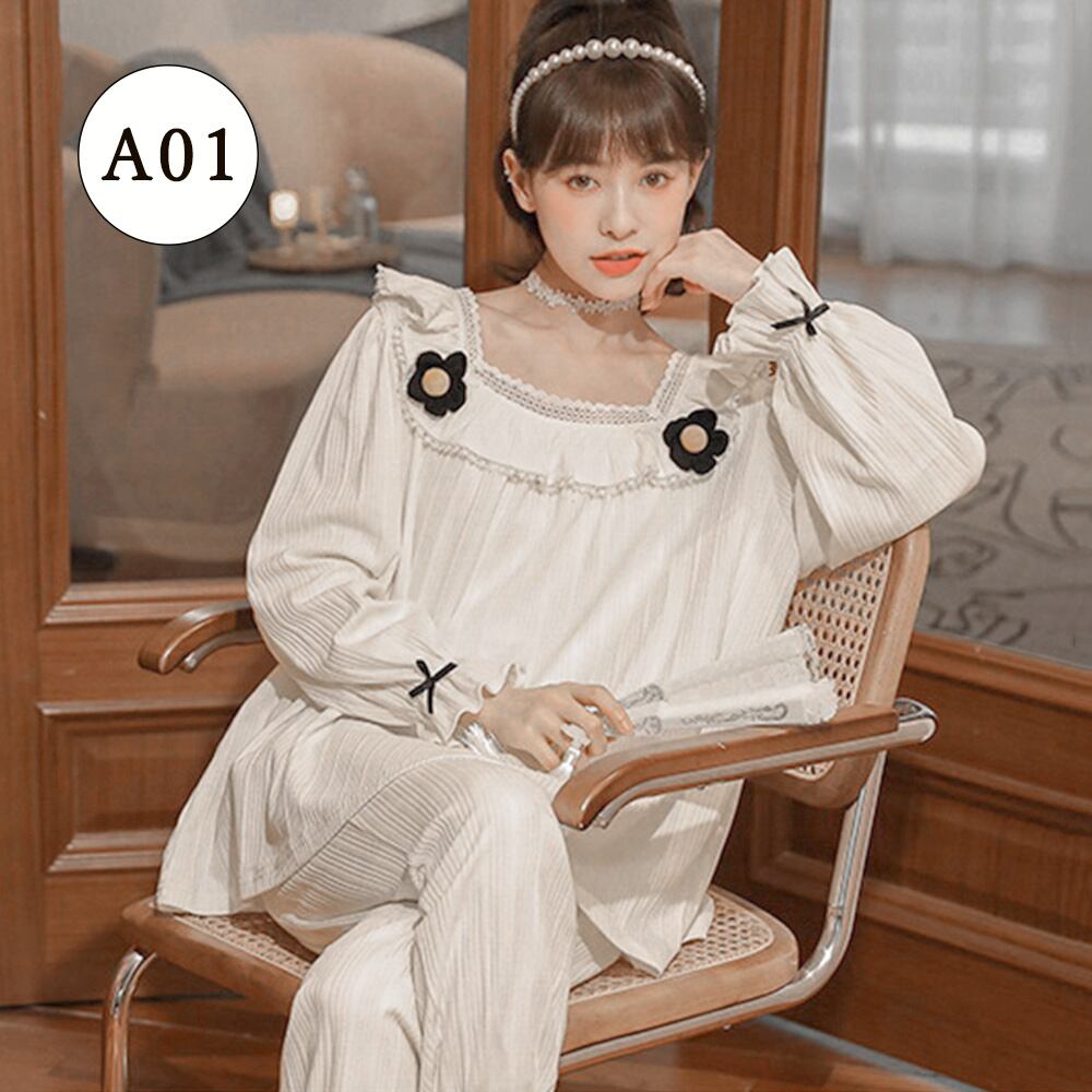 長袖 レディース 部屋着セットアップ 韓国ファッション 白お姫系寝巻き フリル裾長袖 長ズボン 大人 ナイトウェア春秋冬2点セット 寝間着 リラックス お泊り 女子会 パーティーキュートでガーリーな雰囲気がステイホームの時間をハッピーにしてくれるルームウェアセットアップ柔らかな綿混生地でふんわりと優しい肌当たり【大人気7タイプ展開】、お家でのリラックスタイムにはもちろん、宿泊行事にもおすすめ素材:綿75%+ポリエステル25%タイプ:A01-A07サイズ:ワンサイズ(XXL)トップス:着丈:約66cm 肩幅:約30cm 袖丈:約64cm ゆき:約79cm 身幅:約58cm 胸囲:約116-136cmボトムス:着丈:約96cm 股下:約67cm ウエスト(ゴム仕様):約58-110cm ヒップ:約110-128cm もも周り:約62-80cm裏地:なし伸縮性:あり透け感:若干あり生産国:中国※すべて平置きサイズです(採寸方法違いより、多少の誤差がございますので、ご了承ください)。※海外輸入品のため、商品の細部仕様は多少異なる場合がございます。予めご了承の上、ご注文お願い致します。